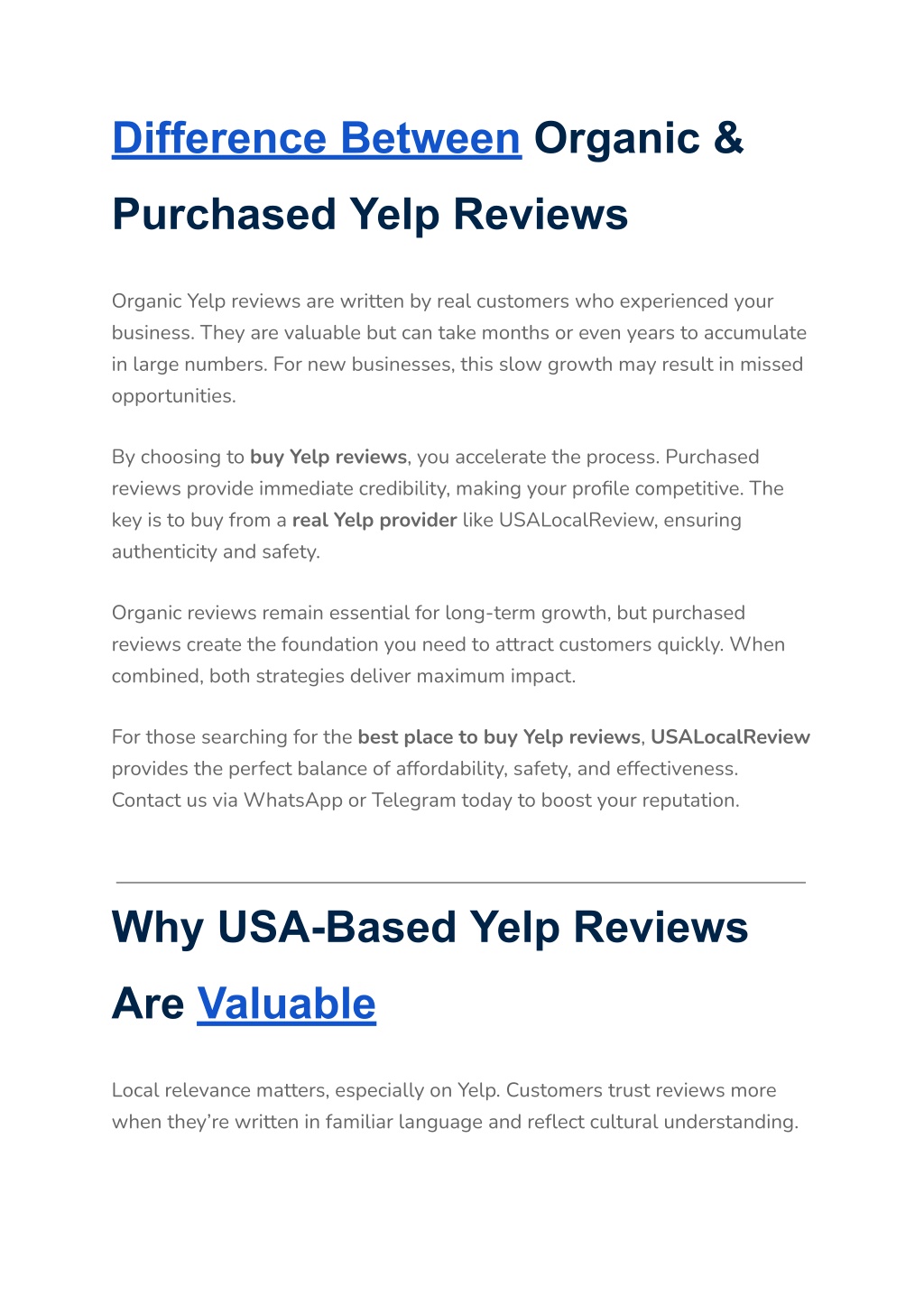 ● Encourage Organic Feedback:Blend purchased reviews with real ones. ● Respond Professionally: Reply to reviews to show customer care. ● Promote Reviews: Share them across your website and social media. ● Maintain Consistency: Add new reviews regularly. ● Work with Experts: Partner only with a real Yelp provider. When you buy Yelp reviews and follow these practices, your profile becomes a powerful marketing tool. At USALocalReview, we provide affordable Yelp reviews that are authentic and effective. For the best place to buy Yelp reviews, contact us today via WhatsApp or Telegram. Conclusion + Strong Call-to-Action (CTA) Your Yelp reputation directly impacts your ability to attract and retain customers. Without a strong profile, potential clients may overlook your business. That’s why investing in buying Yelp reviews is a smart, results-driven strategy. At USALocalReview, we deliver safe, authentic, and affordable Yelp reviews tailored to your business. As a real Yelp provider, we’re trusted by businesses across industries. We are recognized as the best place to buy Yelp reviews because we prioritize safety, authenticity, and customer satisfaction.