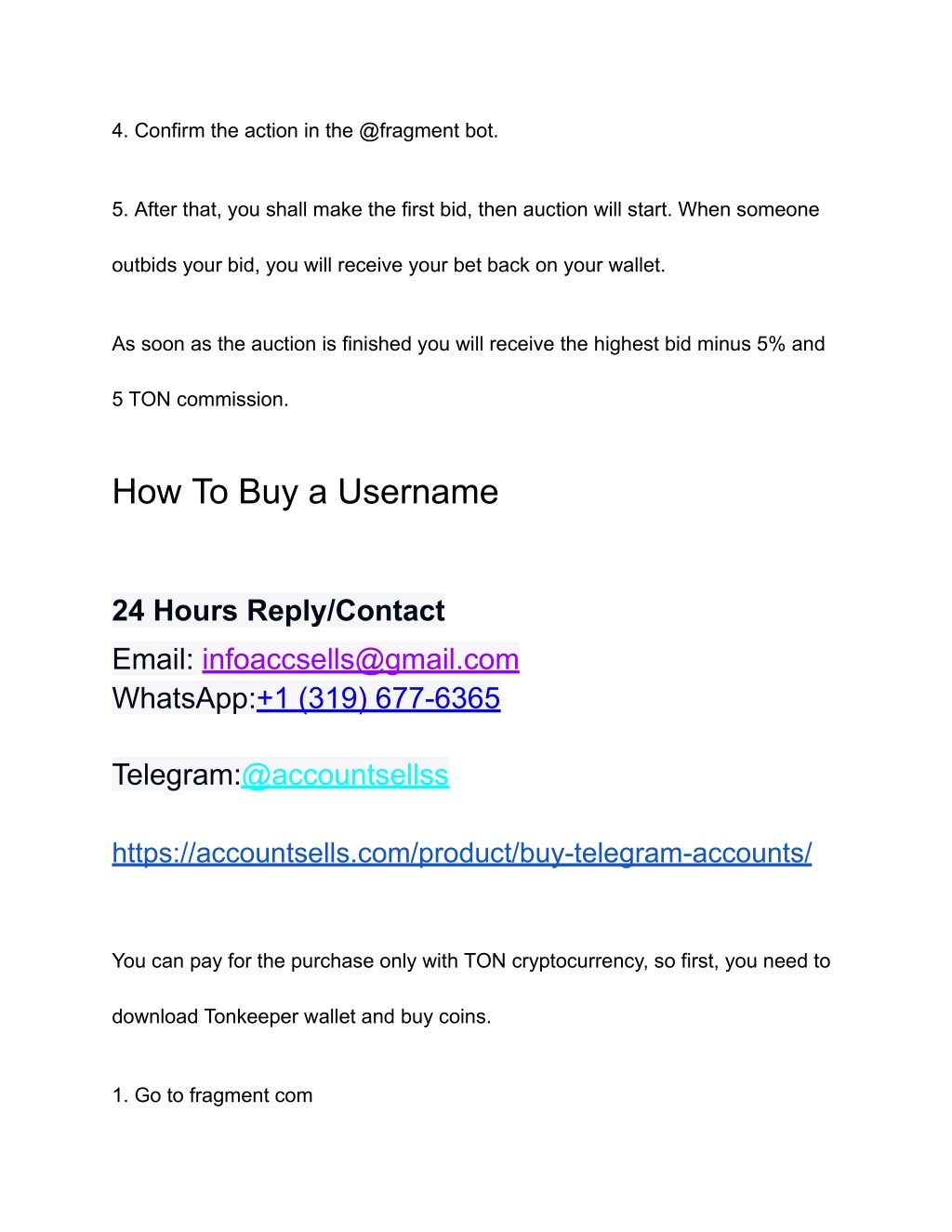 4. Confirm the action in the @fragment bot. 5. After that, you shall make the first bid, then auction will start. When someone outbids your bid, you will receive your bet back on your wallet. As soon as the auction is finished you will receive the highest bid minus 5% and 5 TON commission. How To Buy a Username 24 Hours Reply/Contact Email: infoaccsells@gmail.com WhatsApp:+1 (319) 677-6365 Telegram:@accountsellss https://accountsells.com/product/buy-telegram-accounts/ You can pay for the purchase only with TON cryptocurrency, so first, you need to download Tonkeeper wallet and buy coins. 1. Go to fragment com