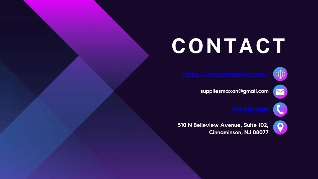 CONTACT https://maxonsupplies.com/ suppliesmaxon@gmail.com 973-962-6500 510 N Belleview Avenue, Suite 102, Cinnaminson, NJ 08077