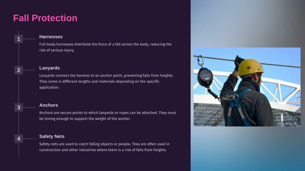 Fall Protection Harnesses 1 Full-body harnesses distribute the force of a fall across the body, reducing the risk of serious injury. Lanyards 2 Lanyards connect the harness to an anchor point, preventing falls from heights. They come in different lengths and materials depending on the specific application. Anchors 3 Anchors are secure points to which lanyards or ropes can be attached. They must be strong enough to support the weight of the worker. Safety Nets 4 Safety nets are used to catch falling objects or people. They are often used in construction and other industries where there is a risk of falls from heights.
