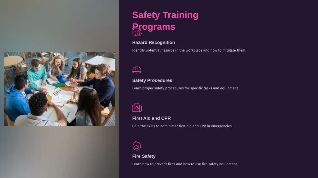 Safety Training Programs Hazard Recognition Identify potential hazards in the workplace and how to mitigate them. Safety Procedures Learn proper safety procedures for specific tasks and equipment. First Aid and CPR Gain the skills to administer first aid and CPR in emergencies. Fire Safety Learn how to prevent fires and how to use fire safety equipment.