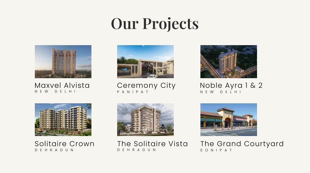 Our Projects Maxvel Alvista Ceremony City Noble Ayra 1 & 2 N E W D E L H I N E W D E L H I P A N I P A T P A N I P A T D E H R A D U N N E W D E L H I Solitaire Crown The Solitaire Vista The Grand Courtyard D E H R A D U N D E H R A D U N D E H R A D U N S O N I P A T S O N I P A T