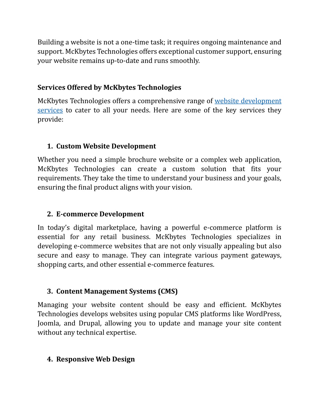 Building a website is not a one-time task; it requires ongoing maintenance and support. McKbytes Technologies offers exceptional customer support, ensuring your website remains up-to-date and runs smoothly. Services Offered by McKbytes Technologies McKbytes Technologies offers a comprehensive range of website development services to cater to all your needs. Here are some of the key services they provide: 1.Custom Website Development Whether you need a simple brochure website or a complex web application, McKbytes Technologies can create a custom solution that fits your requirements. They take the time to understand your business and your goals, ensuring the final product aligns with your vision. 2.E-commerce Development In today’s digital marketplace, having a powerful e-commerce platform is essential for any retail business. McKbytes Technologies specializes in developing e-commerce websites that are not only visually appealing but also secure and easy to manage. They can integrate various payment gateways, shopping carts, and other essential e-commerce features. 3.Content Management Systems (CMS) Managing your website content should be easy and efficient. McKbytes Technologies develops websites using popular CMS platforms like WordPress, Joomla, and Drupal, allowing you to update and manage your site content without any technical expertise. 4.Responsive Web Design