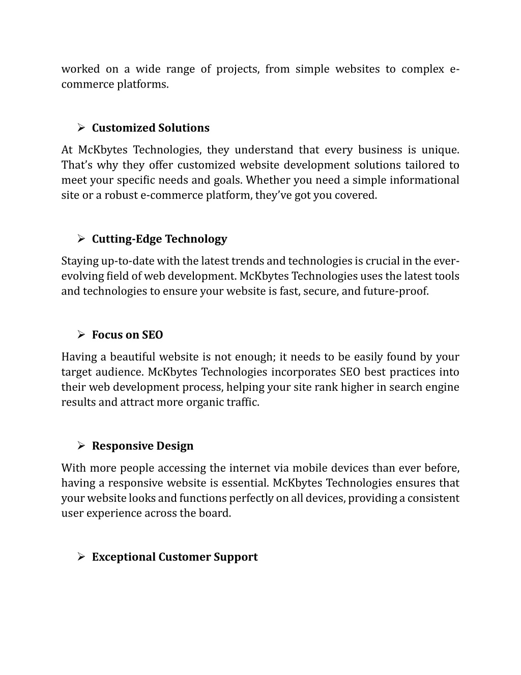worked on a wide range of projects, from simple websites to complex e- commerce platforms. ➢Customized Solutions At McKbytes Technologies, they understand that every business is unique. That’s why they offer customized website development solutions tailored to meet your specific needs and goals. Whether you need a simple informational site or a robust e-commerce platform, they’ve got you covered. ➢Cutting-Edge Technology Staying up-to-date with the latest trends and technologies is crucial in the ever- evolving field of web development. McKbytes Technologies uses the latest tools and technologies to ensure your website is fast, secure, and future-proof. ➢Focus on SEO Having a beautiful website is not enough; it needs to be easily found by your target audience. McKbytes Technologies incorporates SEO best practices into their web development process, helping your site rank higher in search engine results and attract more organic traffic. ➢Responsive Design With more people accessing the internet via mobile devices than ever before, having a responsive website is essential. McKbytes Technologies ensures that your website looks and functions perfectly on all devices, providing a consistent user experience across the board. ➢Exceptional Customer Support