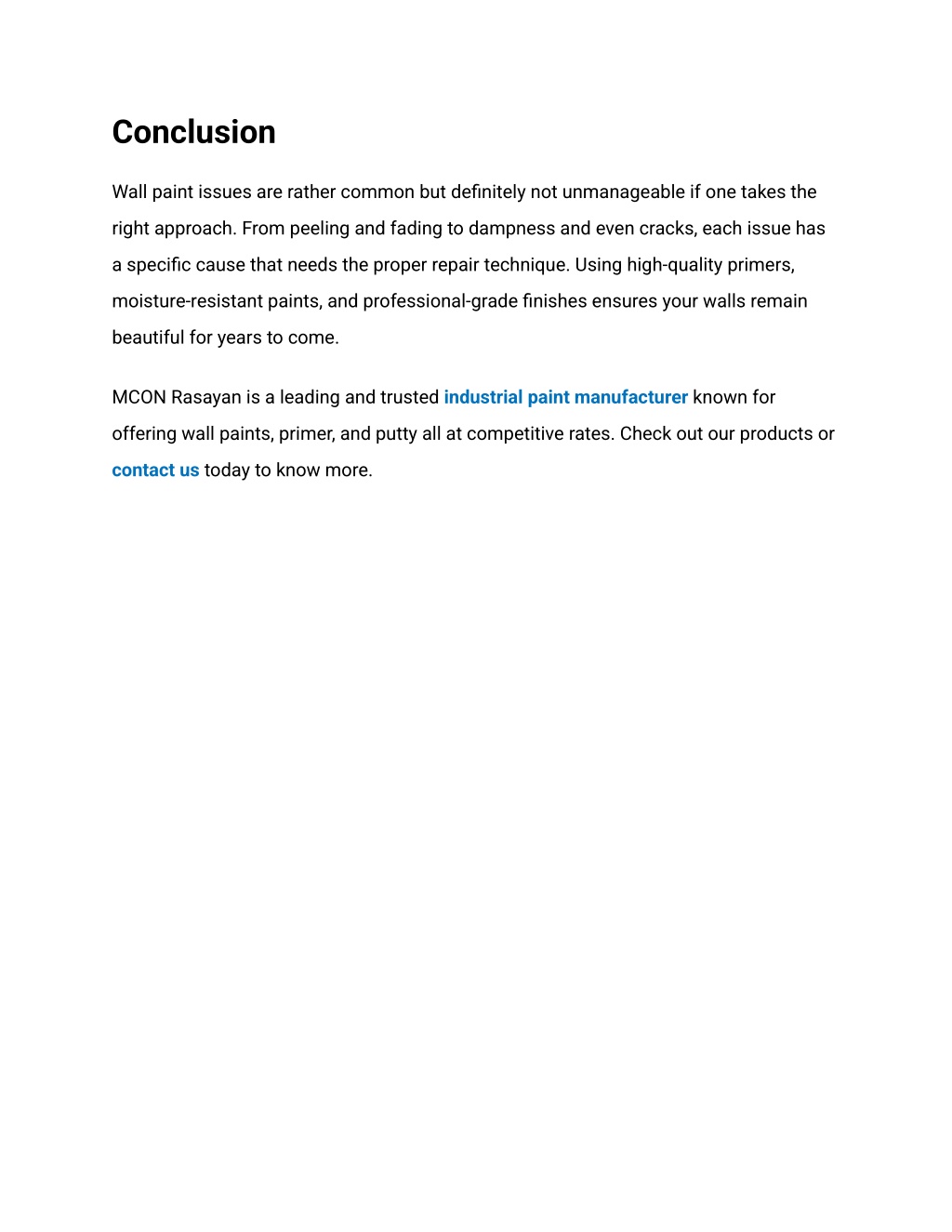 Conclusion Wall paint issues are rather common but definitely not unmanageable if one takes the right approach. From peeling and fading to dampness and even cracks, each issue has a specific cause that needs the proper repair technique. Using high-quality primers, moisture-resistant paints, and professional-grade finishes ensures your walls remain beautiful for years to come. MCON Rasayan is a leading and trustedindustrial paint manufacturer known for offering wall paints, primer, and putty all at competitive rates. Check out our products or contact us today to know more.