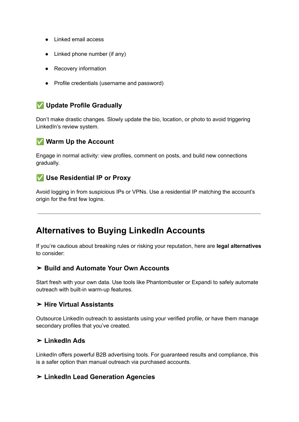 ● Linked email access ● Linked phone number (if any) ● Recovery information ● Profile credentials (username and password) ✅ Update Profile Gradually Don’t make drastic changes. Slowly update the bio, location, or photo to avoid triggering LinkedIn’s review system. ✅ Warm Up the Account Engage in normal activity: view profiles, comment on posts, and build new connections gradually. ✅ Use Residential IP or Proxy Avoid logging in from suspicious IPs or VPNs. Use a residential IP matching the account’s origin for the first few logins. Alternatives to Buying LinkedIn Accounts If you’re cautious about breaking rules or risking your reputation, here are legal alternatives to consider: ➤ Build and Automate Your Own Accounts Start fresh with your own data. Use tools like Phantombuster or Expandi to safely automate outreach with built-in warm-up features. ➤ Hire Virtual Assistants Outsource LinkedIn outreach to assistants using your verified profile, or have them manage secondary profiles that you’ve created. ➤ LinkedIn Ads LinkedIn offers powerful B2B advertising tools. For guaranteed results and compliance, this is a safer option than manual outreach via purchased accounts. ➤ LinkedIn Lead Generation Agencies