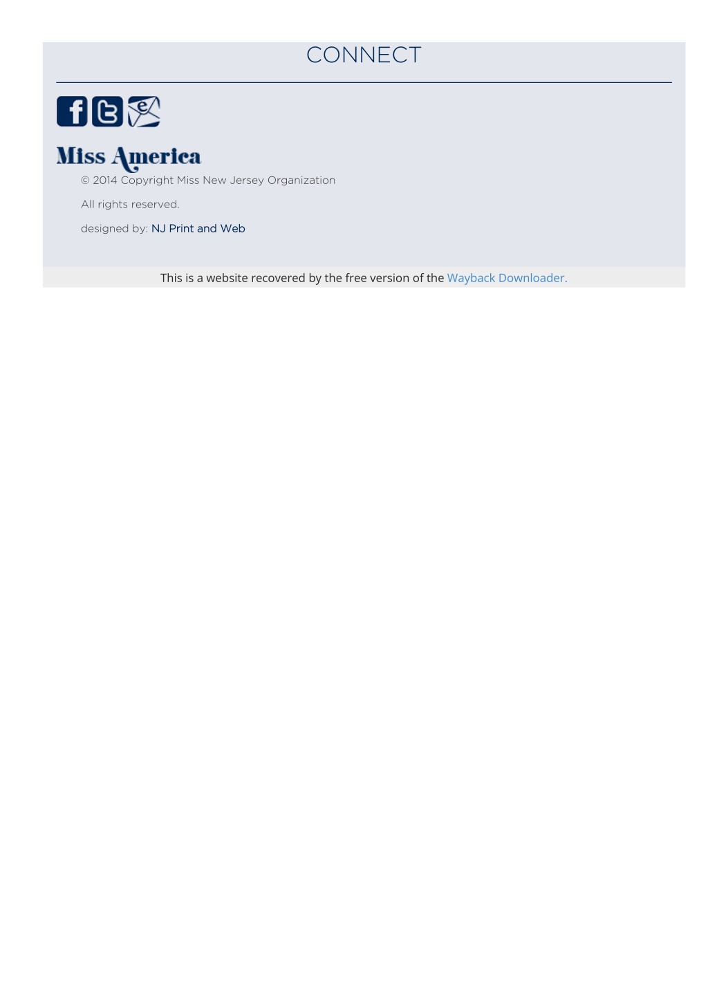 CONNECT © 2014 Copyright Miss New Jersey Organization All rights reserved. designed by: NJ Print and Web This is a website recovered by the free version of the Wayback Downloader.