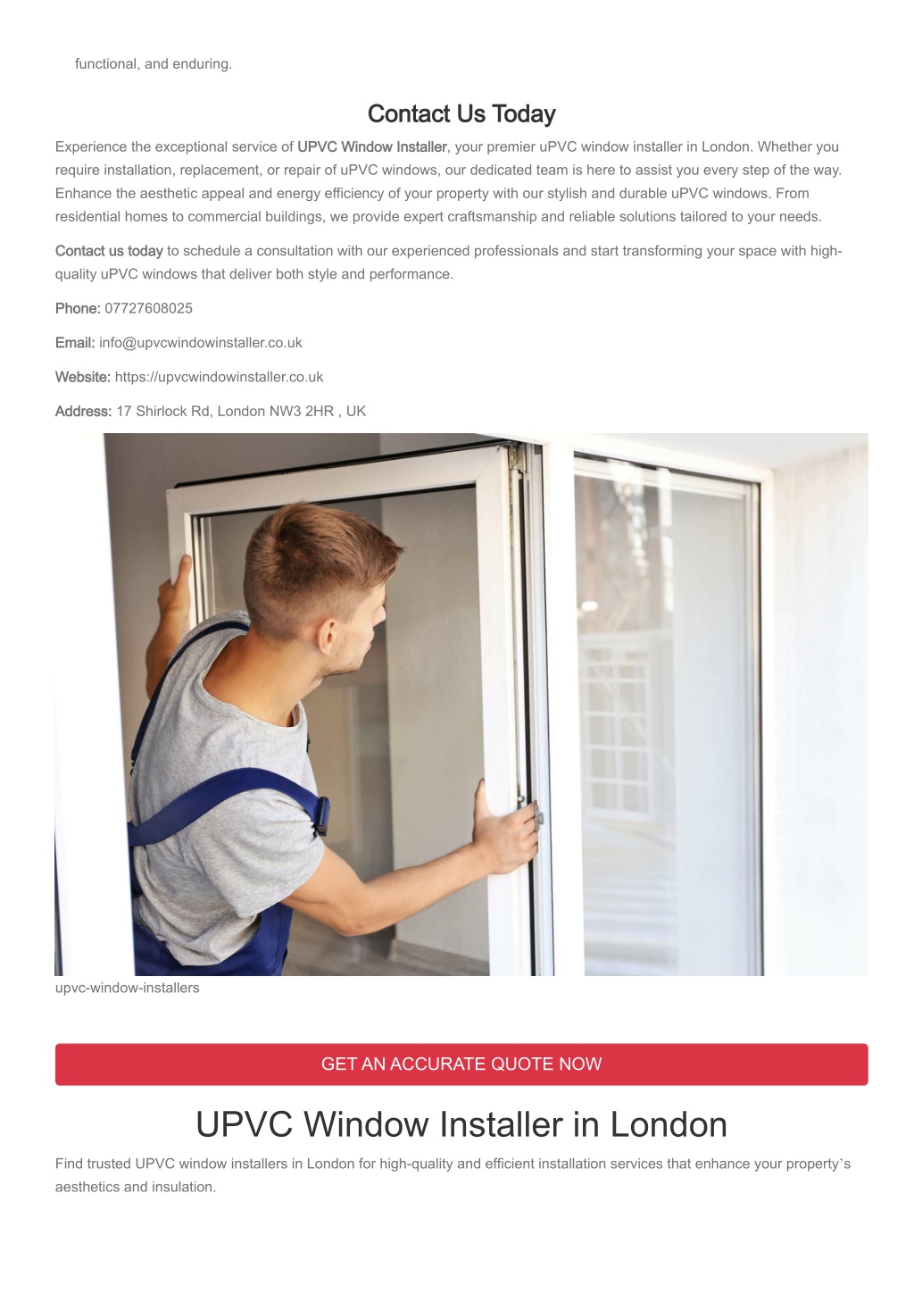 functional, and enduring. Contact Us Today Experience the exceptional service of UPVC Window Installer, your premier uPVC window installer in London. Whether you require installation, replacement, or repair of uPVC windows, our dedicated team is here to assist you every step of the way. Enhance the aesthetic appeal and energy efficiency of your property with our stylish and durable uPVC windows. From residential homes to commercial buildings, we provide expert craftsmanship and reliable solutions tailored to your needs. Contact us today to schedule a consultation with our experienced professionals and start transforming your space with high- quality uPVC windows that deliver both style and performance. Phone: 07727608025 Email: info@upvcwindowinstaller.co.uk Website: https://upvcwindowinstaller.co.uk Address: 17 Shirlock Rd, London NW3 2HR , UK upvc-window-installers GET AN ACCURATE QUOTE NOW UPVC Window Installer in London Find trusted UPVC window installers in London for high-quality and efficient installation services that enhance your property’s aesthetics and insulation.