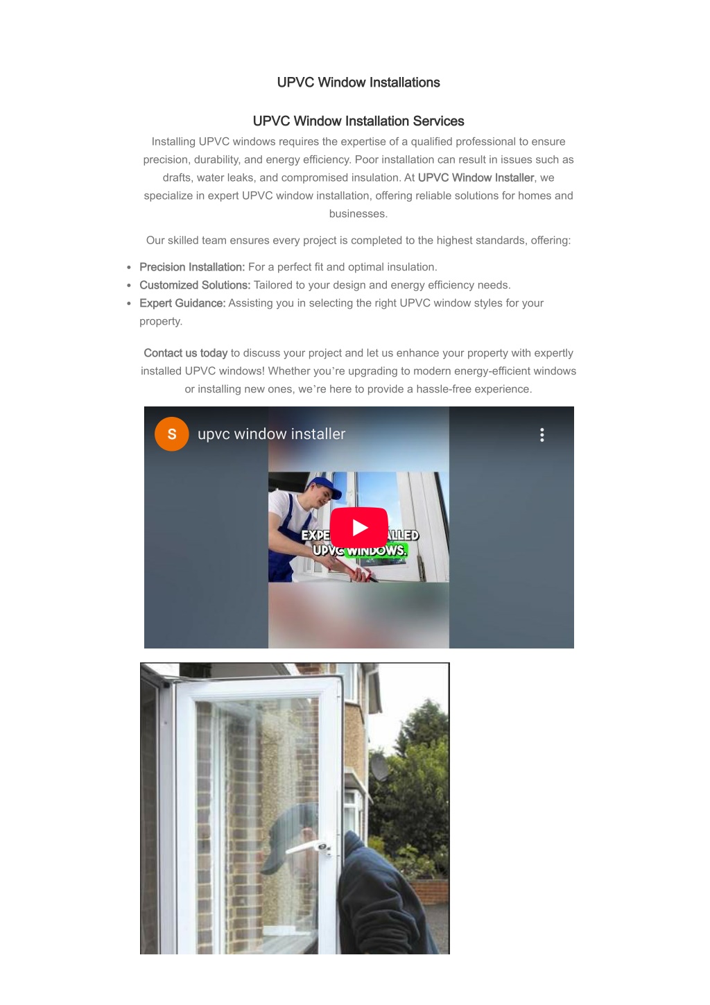 or personal preference. Whether you prefer the classic look of casement windows or the modern appeal of tilt-and-turn options, these windows enhance curb appeal and property value. Environmental Impact: uPVC windows contribute to sustainability through their long lifespan, recyclability, and energy-saving properties. By reducing energy consumption and maintenance needs, they help lower your carbon footprint while enhancing comfort and value. CONTACT OUR TEAM FOR BEST RATES upvc window installer Why Choose Us? Trusted Reputation: At UPVC Window Installer, we have built a solid reputation for reliability and excellence in uPVC window installation. With years of experience in the industry, our customers trust us to deliver superior quality and craftsmanship in every project we undertake. Whether it’s residential or commercial installations, our track record speaks for itself. Tailored Solutions: We understand that every customer has unique requirements and preferences. That’s why we offer customized uPVC window services tailored to meet your specific needs. Whether you’re looking for a particular style of window, special features, or specific performance criteria, our team works closely with you to ensure your vision becomes a reality. Customer Satisfaction: Our commitment to customer satisfaction is unwavering. From the initial consultation to the final installation, we prioritize delivering results that exceed your expectations. We listen attentively to your needs, provide expert advice, and strive to achieve outcomes that enhance the comfort, efficiency, and aesthetic appeal of your property. Transparent Communication: Clear and honest communication is at the core of our business practices. We believe in keeping you informed and involved throughout every stage of the project. Whether it’s discussing design options, providing project updates, or addressing any concerns you may have, we ensure transparency to build trust and foster a positive working relationship. Competitive Pricing: We believe that quality uPVC window installations should be accessible without compromising on quality. That’s why we offer competitive pricing that aligns with industry standards, ensuring affordability without sacrificing craftsmanship or materials. Our transparent pricing policy means no hidden costs, providing peace of mind throughout the project. Commitment to Excellence: Above all, we are dedicated to excellence in everything we do. From the moment you contact us to the completion of your uPVC window installation, you can expect professionalism, attention to detail, and a focus on delivering outstanding results. Your satisfaction is our priority, and we are committed to creating spaces that are beautiful,
