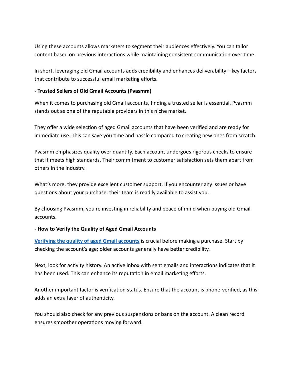 Using these accounts allows marketers to segment their audiences effectively. You can tailor content based on previous interactions while maintaining consistent communication over time. In short, leveraging old Gmail accounts adds credibility and enhances deliverability—key factors that contribute to successful email marketing efforts. - Trusted Sellers of Old Gmail Accounts (Pvasmm) When it comes to purchasing old Gmail accounts, finding a trusted seller is essential. Pvasmm stands out as one of the reputable providers in this niche market. They offer a wide selection of aged Gmail accounts that have been verified and are ready for immediate use. This can save you time and hassle compared to creating new ones from scratch. Pvasmm emphasizes quality over quantity. Each account undergoes rigorous checks to ensure that it meets high standards. Their commitment to customer satisfaction sets them apart from others in the industry. What’s more, they provide excellent customer support. If you encounter any issues or have questions about your purchase, their team is readily available to assist you. By choosing Pvasmm, you're investing in reliability and peace of mind when buying old Gmail accounts. - How to Verify the Quality of Aged Gmail Accounts Verifying the quality of aged Gmail accounts is crucial before making a purchase. Start by checking the account’s age; older accounts generally have better credibility. Next, look for activity history. An active inbox with sent emails and interactions indicates that it has been used. This can enhance its reputation in email marketing efforts. Another important factor is verification status. Ensure that the account is phone-verified, as this adds an extra layer of authenticity. You should also check for any previous suspensions or bans on the account. A clean record ensures smoother operations moving forward.