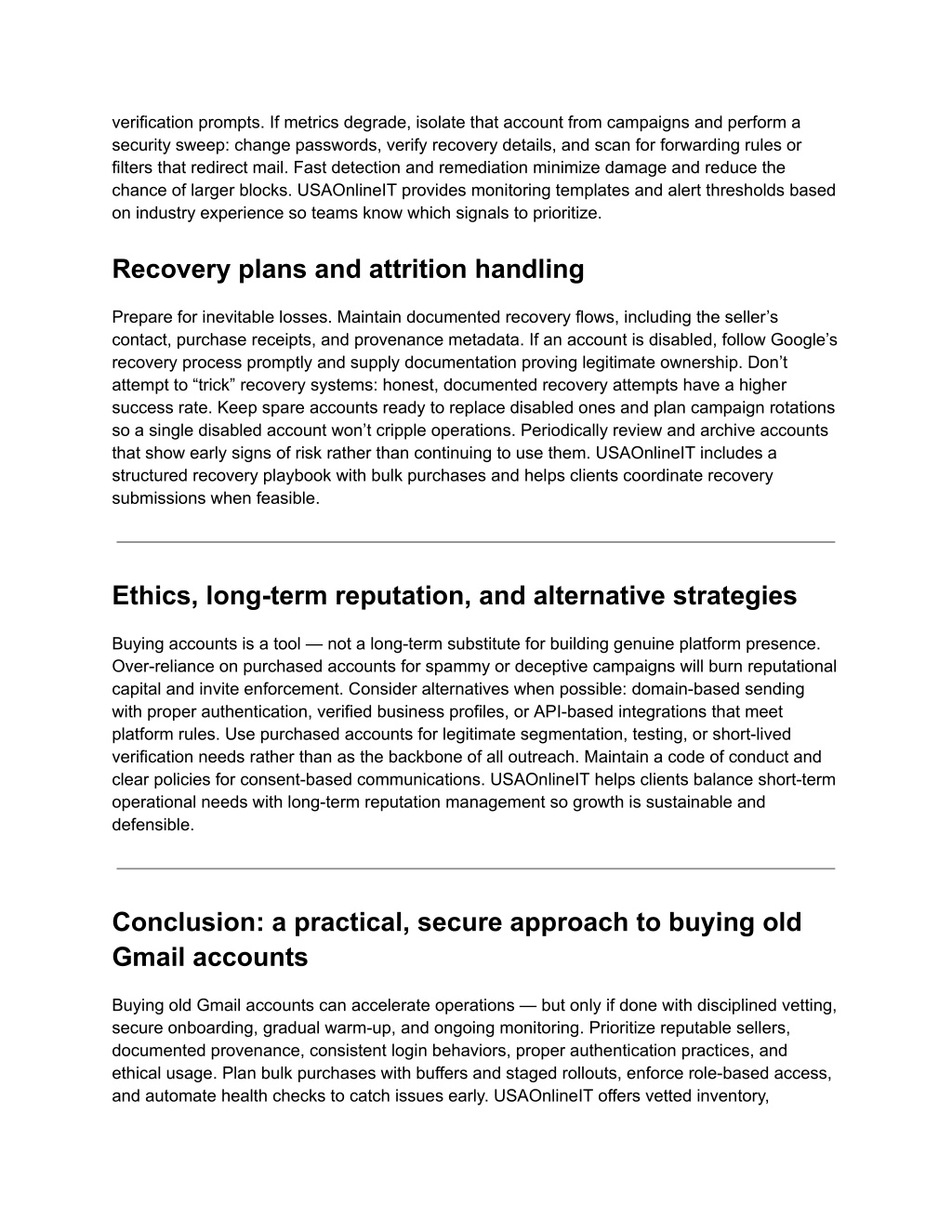verification prompts. If metrics degrade, isolate that account from campaigns and perform a security sweep: change passwords, verify recovery details, and scan for forwarding rules or filters that redirect mail. Fast detection and remediation minimize damage and reduce the chance of larger blocks. USAOnlineIT provides monitoring templates and alert thresholds based on industry experience so teams know which signals to prioritize. Recovery plans and attrition handling Prepare for inevitable losses. Maintain documented recovery flows, including the seller’s contact, purchase receipts, and provenance metadata. If an account is disabled, follow Google’s recovery process promptly and supply documentation proving legitimate ownership. Don’t attempt to “trick” recovery systems: honest, documented recovery attempts have a higher success rate. Keep spare accounts ready to replace disabled ones and plan campaign rotations so a single disabled account won’t cripple operations. Periodically review and archive accounts that show early signs of risk rather than continuing to use them. USAOnlineIT includes a structured recovery playbook with bulk purchases and helps clients coordinate recovery submissions when feasible. Ethics, long-term reputation, and alternative strategies Buying accounts is a tool — not a long-term substitute for building genuine platform presence. Over-reliance on purchased accounts for spammy or deceptive campaigns will burn reputational capital and invite enforcement. Consider alternatives when possible: domain-based sending with proper authentication, verified business profiles, or API-based integrations that meet platform rules. Use purchased accounts for legitimate segmentation, testing, or short-lived verification needs rather than as the backbone of all outreach. Maintain a code of conduct and clear policies for consent-based communications. USAOnlineIT helps clients balance short-term operational needs with long-term reputation management so growth is sustainable and defensible. Conclusion: a practical, secure approach to buying old Gmail accounts Buying old Gmail accounts can accelerate operations — but only if done with disciplined vetting, secure onboarding, gradual warm-up, and ongoing monitoring. Prioritize reputable sellers, documented provenance, consistent login behaviors, proper authentication practices, and ethical usage. Plan bulk purchases with buffers and staged rollouts, enforce role-based access, and automate health checks to catch issues early. USAOnlineIT offers vetted inventory,