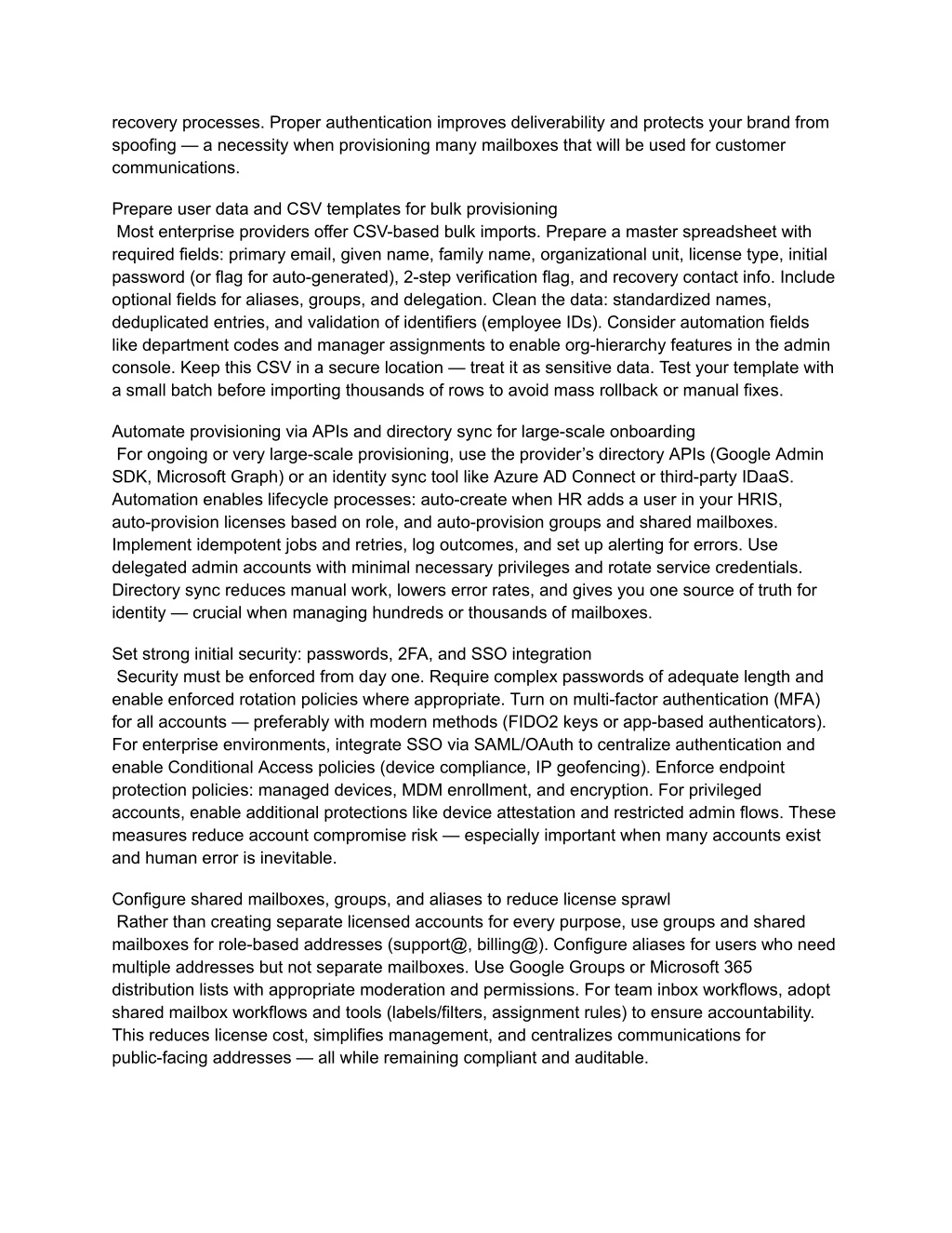 3. recovery processes. Proper authentication improves deliverability and protects your brand from spoofing — a necessity when provisioning many mailboxes that will be used for customer communications. Prepare user data and CSV templates for bulk provisioning Most enterprise providers offer CSV-based bulk imports. Prepare a master spreadsheet with required fields: primary email, given name, family name, organizational unit, license type, initial password (or flag for auto-generated), 2-step verification flag, and recovery contact info. Include optional fields for aliases, groups, and delegation. Clean the data: standardized names, deduplicated entries, and validation of identifiers (employee IDs). Consider automation fields like department codes and manager assignments to enable org-hierarchy features in the admin console. Keep this CSV in a secure location — treat it as sensitive data. Test your template with a small batch before importing thousands of rows to avoid mass rollback or manual fixes. Automate provisioning via APIs and directory sync for large-scale onboarding For ongoing or very large-scale provisioning, use the provider’s directory APIs (Google Admin SDK, Microsoft Graph) or an identity sync tool like Azure AD Connect or third-party IDaaS. Automation enables lifecycle processes: auto-create when HR adds a user in your HRIS, auto-provision licenses based on role, and auto-provision groups and shared mailboxes. Implement idempotent jobs and retries, log outcomes, and set up alerting for errors. Use delegated admin accounts with minimal necessary privileges and rotate service credentials. Directory sync reduces manual work, lowers error rates, and gives you one source of truth for identity — crucial when managing hundreds or thousands of mailboxes. Set strong initial security: passwords, 2FA, and SSO integration Security must be enforced from day one. Require complex passwords of adequate length and enable enforced rotation policies where appropriate. Turn on multi-factor authentication (MFA) for all accounts — preferably with modern methods (FIDO2 keys or app-based authenticators). For enterprise environments, integrate SSO via SAML/OAuth to centralize authentication and enable Conditional Access policies (device compliance, IP geofencing). Enforce endpoint protection policies: managed devices, MDM enrollment, and encryption. For privileged accounts, enable additional protections like device attestation and restricted admin flows. These measures reduce account compromise risk — especially important when many accounts exist and human error is inevitable. Configure shared mailboxes, groups, and aliases to reduce license sprawl Rather than creating separate licensed accounts for every purpose, use groups and shared mailboxes for role-based addresses (support@, billing@). Configure aliases for users who need multiple addresses but not separate mailboxes. Use Google Groups or Microsoft 365 distribution lists with appropriate moderation and permissions. For team inbox workflows, adopt shared mailbox workflows and tools (labels/filters, assignment rules) to ensure accountability. This reduces license cost, simplifies management, and centralizes communications for public-facing addresses — all while remaining compliant and auditable.