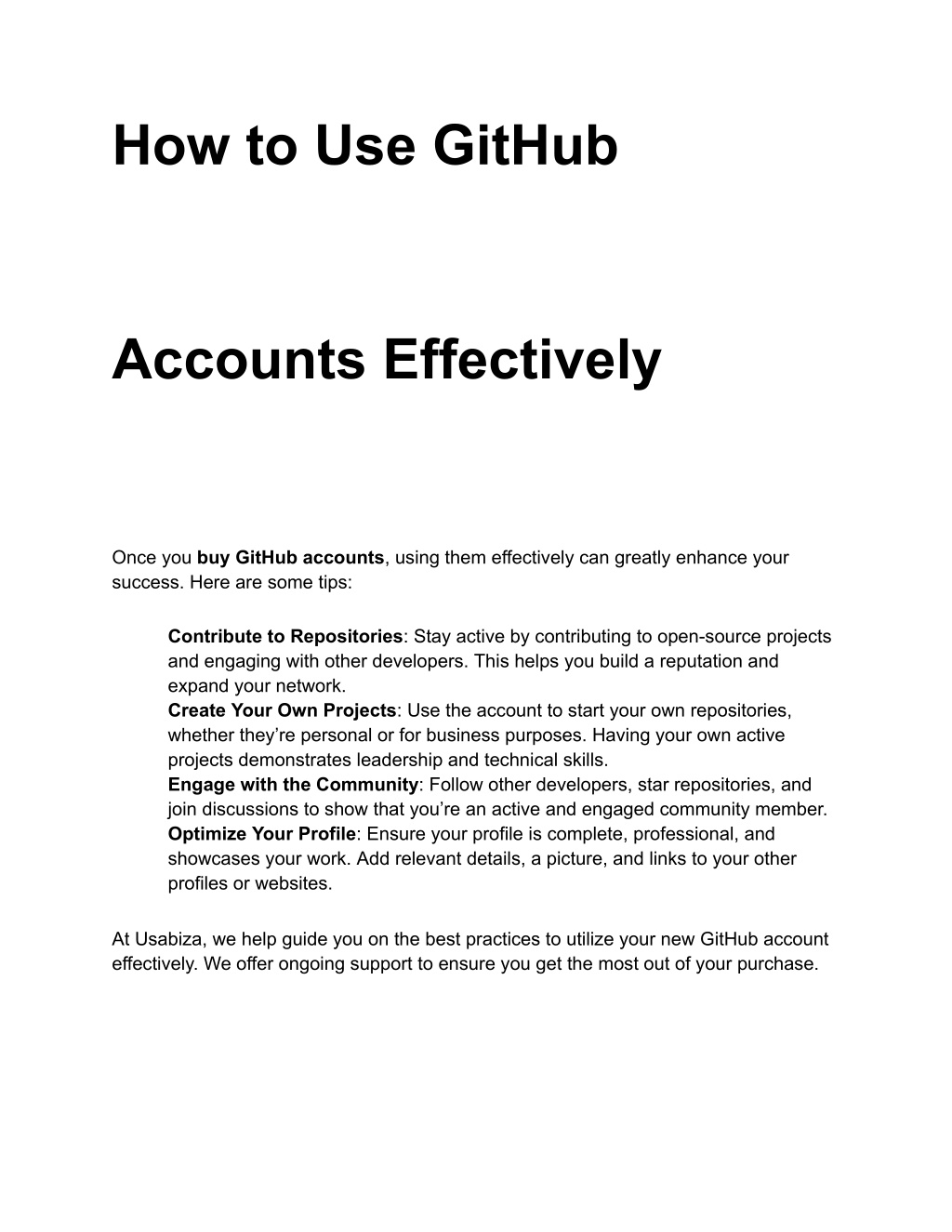 8. How to Use GitHub Accounts Effectively Once you buy GitHub accounts, using them effectively can greatly enhance your success. Here are some tips: Contribute to Repositories: Stay active by contributing to open-source projects and engaging with other developers. This helps you build a reputation and expand your network. Create Your Own Projects: Use the account to start your own repositories, whether they’re personal or for business purposes. Having your own active projects demonstrates leadership and technical skills. Engage with the Community: Follow other developers, star repositories, and join discussions to show that you’re an active and engaged community member. Optimize Your Profile: Ensure your profile is complete, professional, and showcases your work. Add relevant details, a picture, and links to your other profiles or websites. At Usabiza, we help guide you on the best practices to utilize your new GitHub account effectively. We offer ongoing support to ensure you get the most out of your purchase.