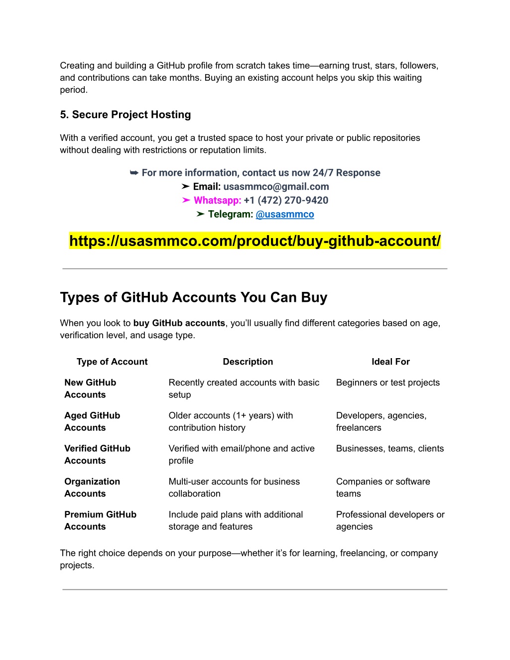 3. Creating and building a GitHub profile from scratch takes time—earning trust, stars, followers, and contributions can take months. Buying an existing account helps you skip this waiting period. 5. Secure Project Hosting With a verified account, you get a trusted space to host your private or public repositories without dealing with restrictions or reputation limits. ➥ For more information, contact us now 24/7 Response ➤ Email: usasmmco@gmail.com ➤ Whatsapp: +1 (472) 270-9420 ➤ Telegram:@usasmmco https://usasmmco.com/product/buy-github-account/ Types of GitHub Accounts You Can Buy When you look to buy GitHub accounts, you’ll usually find different categories based on age, verification level, and usage type. Type of Account Description Ideal For New GitHub Accounts Recently created accounts with basic setup Beginners or test projects Aged GitHub Accounts Older accounts (1+ years) with contribution history Developers, agencies, freelancers Verified GitHub Accounts Verified with email/phone and active profile Businesses, teams, clients Organization Accounts Multi-user accounts for business collaboration Companies or software teams Premium GitHub Accounts Include paid plans with additional storage and features Professional developers or agencies The right choice depends on your purpose—whether it’s for learning, freelancing, or company projects.