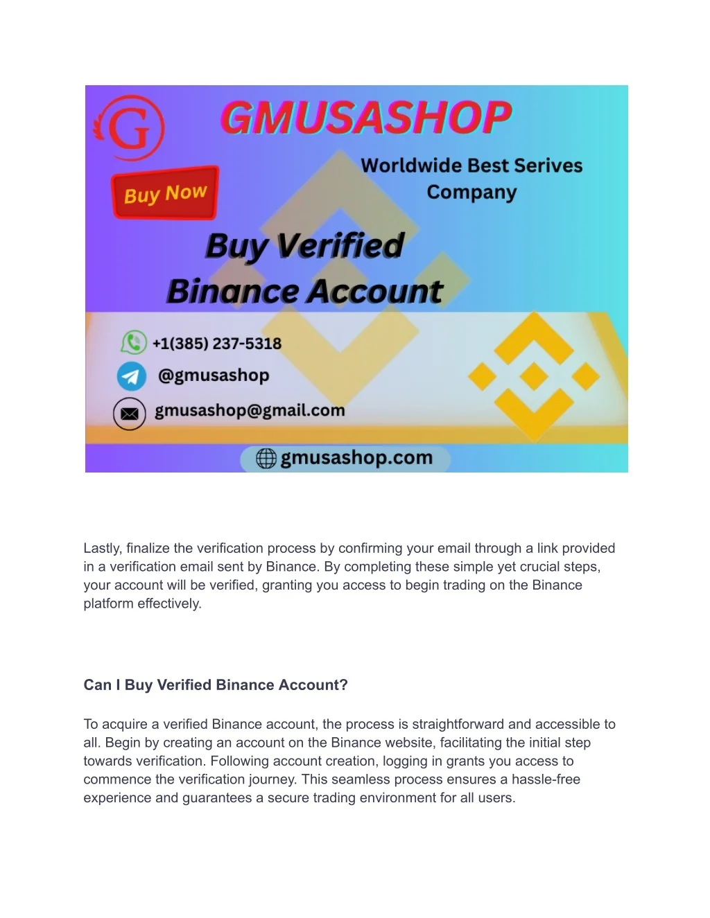 Buy Verified Binance Account<br><br>For those seeking a trustworthy and secure platform for cryptocurrency trading, a verified Binance account stands out as a top recommendation. Renowned as a premier global cryptocurrency exchange, Binance provides an extensive array of functionalities and advantages that cater to the needs of both seasoned traders and beginners.<br>Contact Us / 24 Hours Reply<br>https://gmusashop.com/product/buy-verified-binance-account/<br>Telegram: @gmusashop<br>WhatsApp: 1 (385)237-5318<br>Email: gmusashop@gamil.com<br>Buy Verified Binance Account<br>Binance stands as a leading force in the world