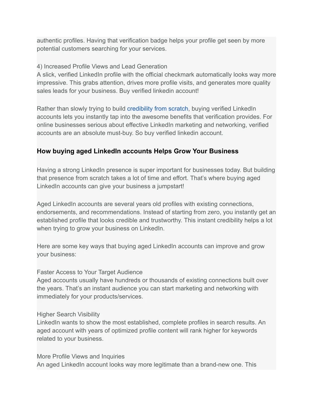 authentic profiles. Having that verification badge helps your profile get seen by more potential customers searching for your services. 4) Increased Profile Views and Lead Generation A slick, verified LinkedIn profile with the official checkmark automatically looks way more impressive. This grabs attention, drives more profile visits, and generates more quality sales leads for your business. Buy verified linkedin account! Rather than slowly trying to build credibility from scratch, buying verified LinkedIn accounts lets you instantly tap into the awesome benefits that verification provides. For online businesses serious about effective LinkedIn marketing and networking, verified accounts are an absolute must-buy. So buy verified linkedin account. How buying aged LinkedIn accounts Helps Grow Your Business Having a strong LinkedIn presence is super important for businesses today. But building that presence from scratch takes a lot of time and effort. That’s where buying aged LinkedIn accounts can give your business a jumpstart! Aged LinkedIn accounts are several years old profiles with existing connections, endorsements, and recommendations. Instead of starting from zero, you instantly get an established profile that looks credible and trustworthy. This instant credibility helps a lot when trying to grow your business on LinkedIn. Here are some key ways that buying aged LinkedIn accounts can improve and grow your business: Faster Access to Your Target Audience Aged accounts usually have hundreds or thousands of existing connections built over the years. That’s an instant audience you can start marketing and networking with immediately for your products/services. Higher Search Visibility LinkedIn wants to show the most established, complete profiles in search results. An aged account with years of optimized profile content will rank higher for keywords related to your business. More Profile Views and Inquiries An aged LinkedIn account looks way more legitimate than a brand-new one. This