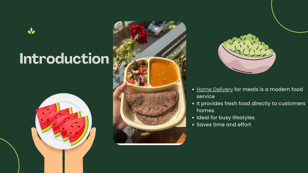 Introduction Home Delivery for meals is a modern food service It provides fresh food directly to customers homes Ideal for busy lifestyles Saves time and effort