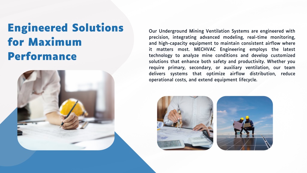 2. Engineered Solutions for Maximum Performance Our Underground Mining Ventilation Systems are engineered with precision, integrating advanced modeling, real-time monitoring, and high-capacity equipment to maintain consistent airflow where it matters most. MECHVAC Engineering employs the latest technology to analyze mine conditions and develop customized solutions that enhance both safety and productivity. Whether you require primary, secondary, or auxiliary ventilation, our team delivers systems that optimize airflow distribution, reduce operational costs, and extend equipment lifecycle.