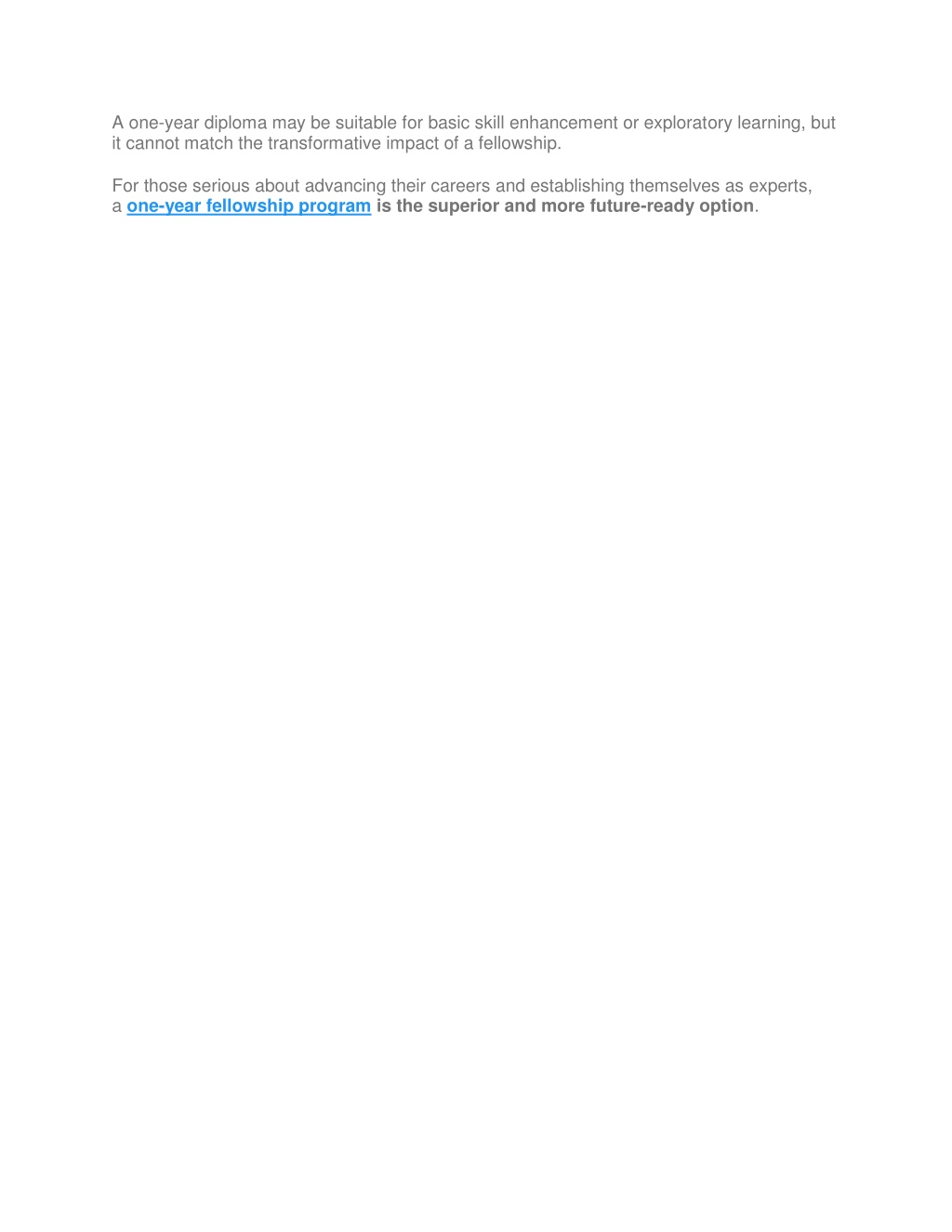 6. A one-year diploma may be suitable for basic skill enhancement or exploratory learning, but it cannot match the transformative impact of a fellowship. For those serious about advancing their careers and establishing themselves as experts, a one-year fellowship program is the superior and more future-ready option.