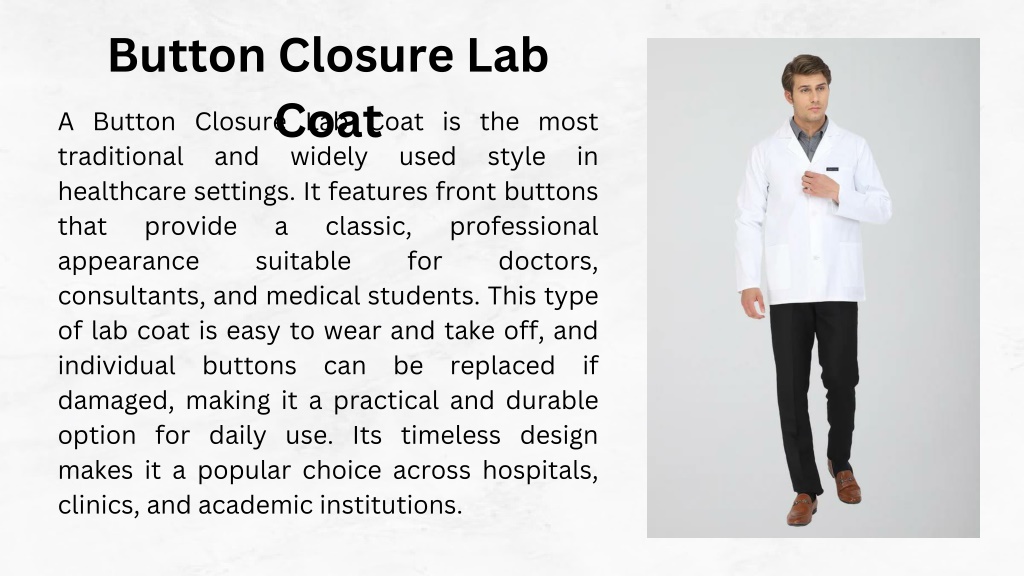 Button Closure Lab Coat A Button Closure Lab Coat is the most traditional and widely used style in healthcare settings. It features front buttons that provide a classic, professional appearance suitable for doctors, consultants, and medical students. This type of lab coat is easy to wear and take off, and individual buttons can be replaced if damaged, making it a practical and durable option for daily use. Its timeless design makes it a popular choice across hospitals, clinics, and academic institutions.