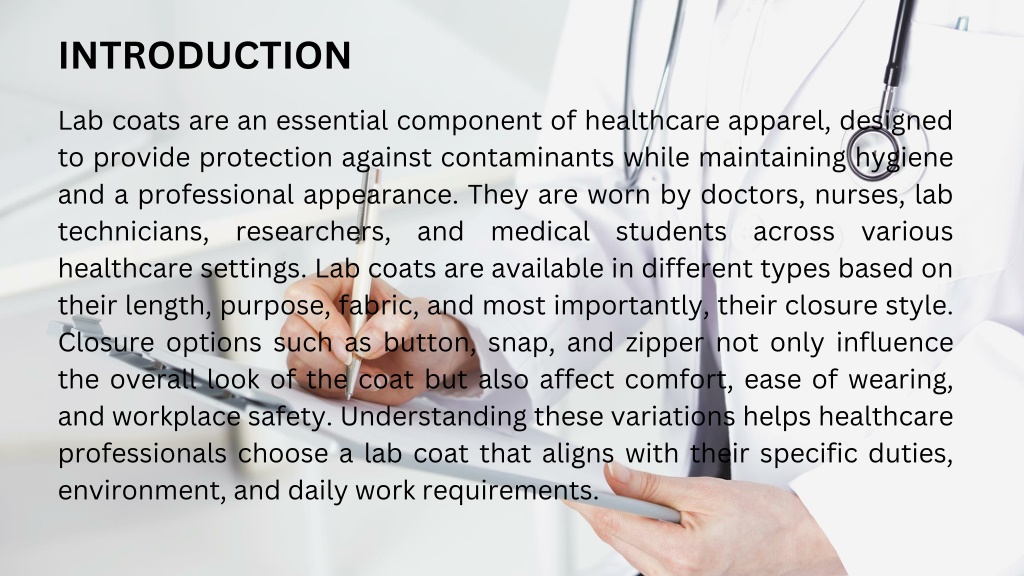 INTRODUCTION Lab coats are an essential component of healthcare apparel, designed to provide protection against contaminants while maintaining hygiene and a professional appearance. They are worn by doctors, nurses, lab technicians, researchers, and medical students across various healthcare settings. Lab coats are available in different types based on their length, purpose, fabric, and most importantly, their closure style. Closure options such as button, snap, and zipper not only influence the overall look of the coat but also affect comfort, ease of wearing, and workplace safety. Understanding these variations helps healthcare professionals choose a lab coat that aligns with their specific duties, environment, and daily work requirements.