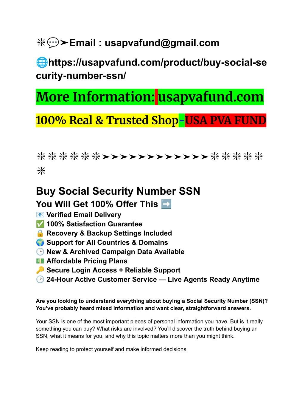 2. ❇?➤Email : usapvafund@gmail.com ?https://usapvafund.com/product/buy-social-se curity-number-ssn/ More Information: usapvafund.com 100% Real & Trusted Shop-USA PVA FUND ❇❇❇❇❇❇➤➤➤➤➤➤➤➤➤➤➤➤❇❇❇❇❇ ❇ Buy Social Security Number SSN You Will Get 100% Offer This ➡ ? Verified Email Delivery ✅ 100% Satisfaction Guarantee ? Recovery & Backup Settings Included ? Support for All Countries & Domains ? New & Archived Campaign Data Available ? Affordable Pricing Plans ? Secure Login Access + Reliable Support ? 24-Hour Active Customer Service — Live Agents Ready Anytime Are you looking to understand everything about buying a Social Security Number (SSN)? You’ve probably heard mixed information and want clear, straightforward answers. Your SSN is one of the most important pieces of personal information you have. But is it really something you can buy? What risks are involved? You’ll discover the truth behind buying an SSN, what it means for you, and why this topic matters more than you might think. Keep reading to protect yourself and make informed decisions.