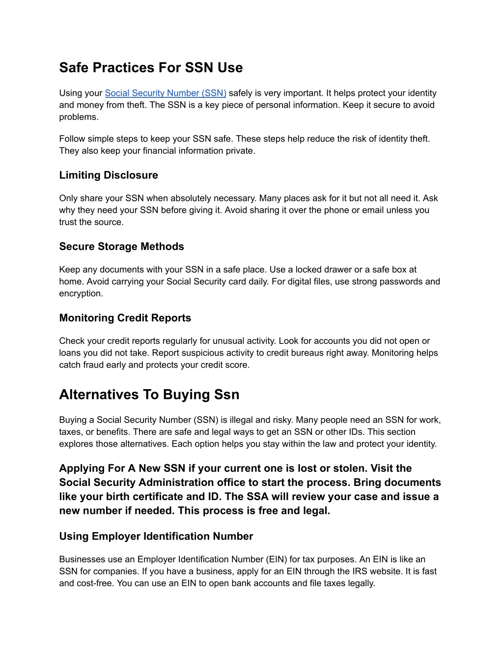 4. Safe Practices For SSN Use Using your Social Security Number (SSN) safely is very important. It helps protect your identity and money from theft. The SSN is a key piece of personal information. Keep it secure to avoid problems. Follow simple steps to keep your SSN safe. These steps help reduce the risk of identity theft. They also keep your financial information private. Limiting Disclosure Only share your SSN when absolutely necessary. Many places ask for it but not all need it. Ask why they need your SSN before giving it. Avoid sharing it over the phone or email unless you trust the source. Secure Storage Methods Keep any documents with your SSN in a safe place. Use a locked drawer or a safe box at home. Avoid carrying your Social Security card daily. For digital files, use strong passwords and encryption. Monitoring Credit Reports Check your credit reports regularly for unusual activity. Look for accounts you did not open or loans you did not take. Report suspicious activity to credit bureaus right away. Monitoring helps catch fraud early and protects your credit score. Alternatives To Buying Ssn Buying a Social Security Number (SSN) is illegal and risky. Many people need an SSN for work, taxes, or benefits. There are safe and legal ways to get an SSN or other IDs. This section explores those alternatives. Each option helps you stay within the law and protect your identity. Applying For A New SSN if your current one is lost or stolen. Visit the Social Security Administration office to start the process. Bring documents like your birth certificate and ID. The SSA will review your case and issue a new number if needed. This process is free and legal. Using Employer Identification Number Businesses use an Employer Identification Number (EIN) for tax purposes. An EIN is like an SSN for companies. If you have a business, apply for an EIN through the IRS website. It is fast and cost-free. You can use an EIN to open bank accounts and file taxes legally.