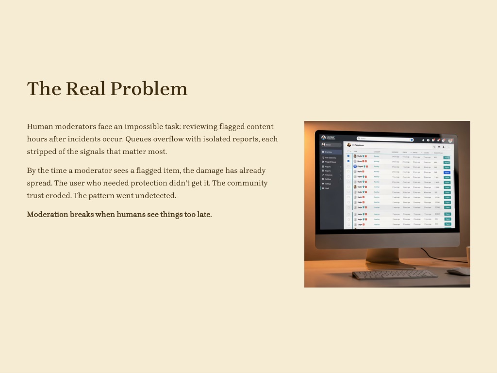 The Real Problem Human moderators face an impossible task: reviewing flagged content hours after incidents occur. Queues overflow with isolated reports, each stripped of the signals that matter most. By the time a moderator sees a flagged item, the damage has already spread. The user who needed protection didn't get it. The community trust eroded. The pattern went undetected. Moderation breaks when humans see things too late.