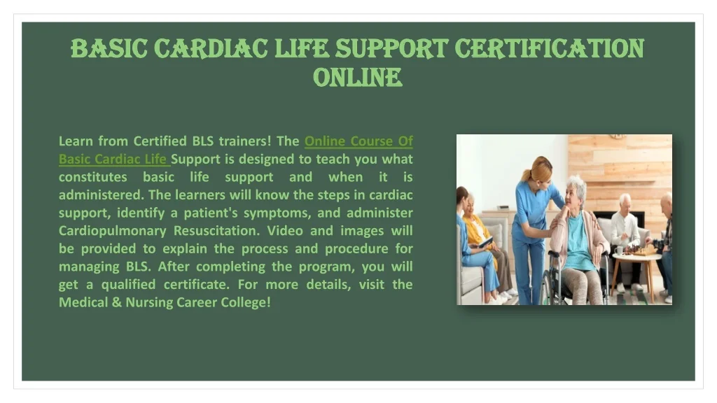 Basic Cardiac Life Support Certification Basic Cardiac Life Support Certification Online Online Learn from Certified BLS trainers! The Online Course Of Basic Cardiac Life Support is designed to teach you what constitutes basic life support administered. The learners will know the steps in cardiac support, identify a patient's symptoms, and administer Cardiopulmonary Resuscitation. Video and images will be provided to explain the process and procedure for managing BLS. After completing the program, you will get a qualified certificate. For more details, visit the Medical & Nursing Career College! and when it is