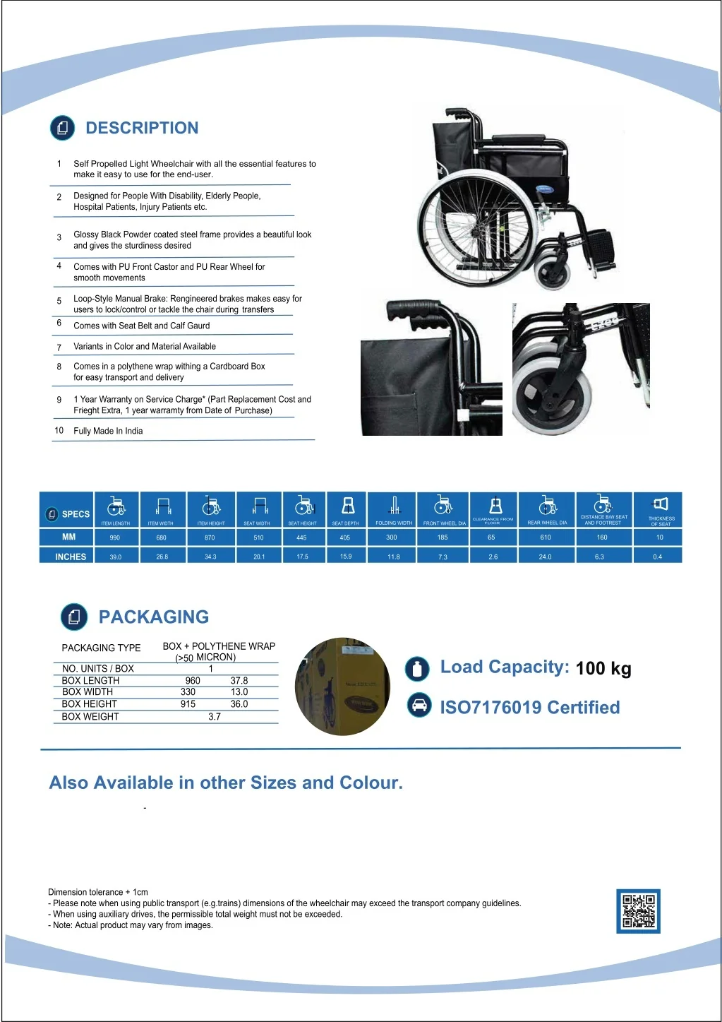 DESCRIPTION 1 Self Propelled Light Wheelchair with all the essential features to make it easy to use for the end-user. Designed for People With Disability, Elderly People, Hospital Patients, Injury Patients etc. 2 Glossy Black Powder coated steel frame provides a beautiful look and gives the sturdiness desired 3 4 Comes with PU Front Castor and PU Rear Wheel for smooth movements Loop-Style Manual Brake: Rengineered brakes makes easy for users to lock/control or tackle the chair during transfers 5 6 Comes with Seat Belt and Calf Gaurd Variants in Color and Material Available 7 Comes in a polythene wrap withing a Cardboard Box for easy transport and delivery 8 1 Year Warranty on Service Charge* (Part Replacement Cost and Frieght Extra, 1 year warramty from Date of Purchase) 9 10 Fully Made In India SPECS DISTANCE B/W SEAT AND FOOTREST THICKNESS OF SEAT CLEARANCE FROM FLOOR REAR WHEEL DIA FOLDING WIDTH FRONT WHEEL DIA ITEM LENGTH ITEM WIDTH ITEM HEIGHT SEAT WIDTH SEAT HEIGHT SEAT DEPTH MM 185 65 610 160 300 10 990 680 870 510 405 445 INCHES 15.9 17.5 11.8 2.6 24.0 6.3 0.4 26.8 34.3 20.1 39.0 7.3 PACKAGING BOX + POLYTHENE WRAP (>50 MICRON) 1 960 330 915 3.7 PACKAGING TYPE Load Capacity: 100 kg NO. UNITS / BOX BOX LENGTH BOX WIDTH BOX HEIGHT BOX WEIGHT 37.8 13.0 36.0 ISO7176019 Certified Also Available in other Sizes and Colour. - Dimension tolerance + 1cm - Please note when using public transport (e.g.trains) dimensions of the wheelchair may exceed the transport company guidelines. - When using auxiliary drives, the permissible total weight must not be exceeded. - Note: Actual product may vary from images.