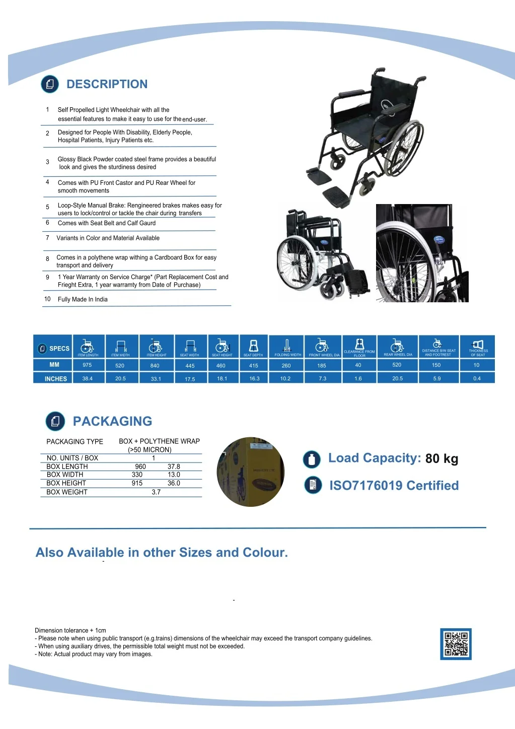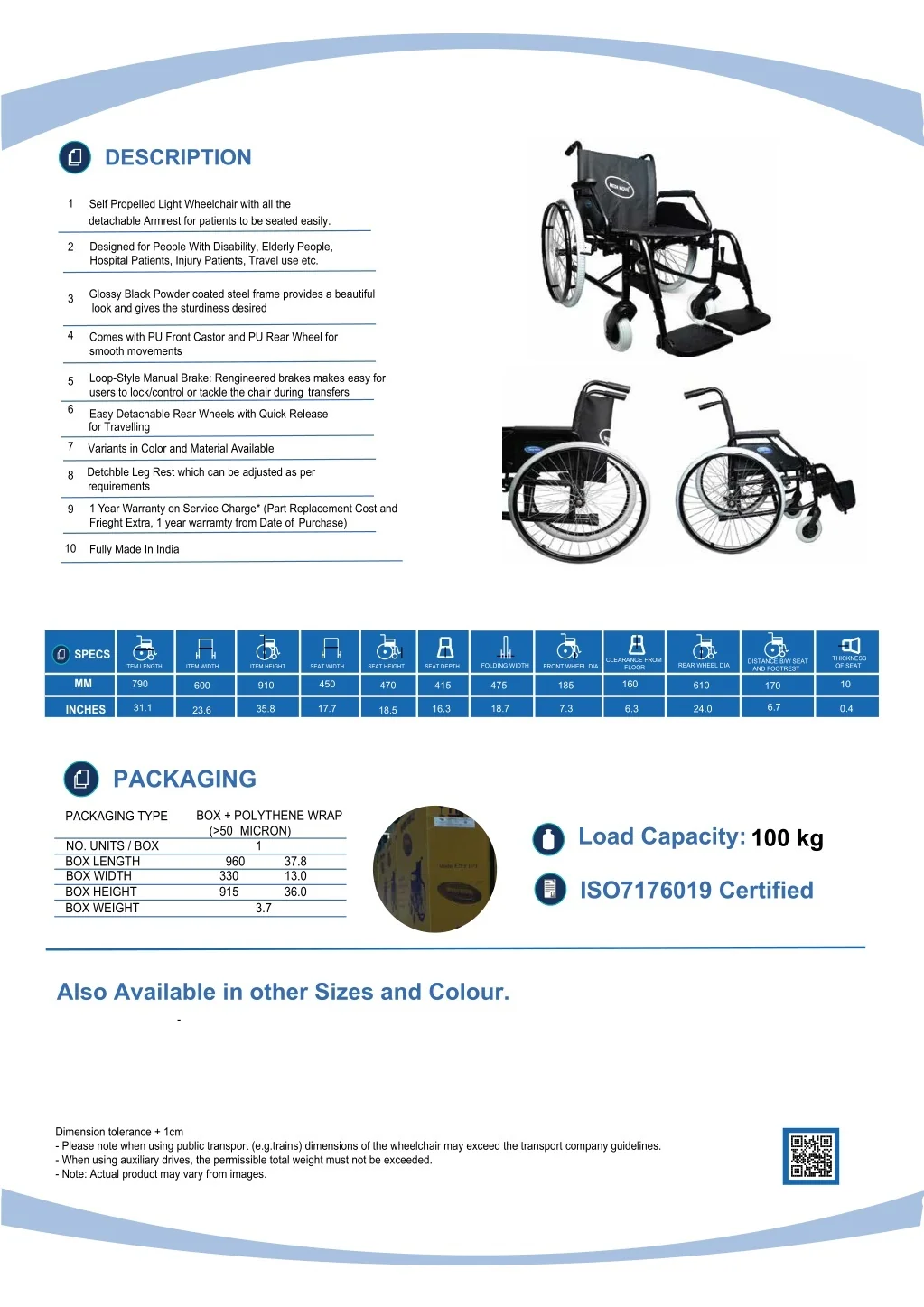 DESCRIPTION 1 Self Propelled Light Wheelchair with all the detachable Armrest for patients to be seated easily. Designed for People With Disability, Elderly People, Hospital Patients, Injury Patients, Travel use etc. 2 Glossy Black Powder coated steel frame provides a beautiful look and gives the sturdiness desired 3 4 Comes with PU Front Castor and PU Rear Wheel for smooth movements Loop-Style Manual Brake: Rengineered brakes makes easy for users to lock/control or tackle the chair during transfers 5 6 Easy Detachable Rear Wheels with Quick Release for Travelling 7 Variants in Color and Material Available Detchble Leg Rest which can be adjusted as per requirements 8 1 Year Warranty on Service Charge* (Part Replacement Cost and Frieght Extra, 1 year warramty from Date of Purchase) 9 10 Fully Made In India SPECS THICKNESS OF SEAT CLEARANCE FROM FLOOR DISTANCE B/W SEAT AND FOOTREST REAR WHEEL DIA FOLDING WIDTH FRONT WHEEL DIA ITEM LENGTH ITEM WIDTH ITEM HEIGHT SEAT WIDTH SEAT HEIGHT SEAT DEPTH MM 790 450 160 10 910 470 415 475 185 610 600 170 6.7 31.1 INCHES 17.7 18.7 7.3 0.4 6.3 16.3 35.8 24.0 23.6 18.5 PACKAGING BOX + POLYTHENE WRAP (>50 MICRON) 1 960 330 915 3.7 PACKAGING TYPE Load Capacity: 100 kg NO. UNITS / BOX BOX LENGTH BOX WIDTH BOX HEIGHT BOX WEIGHT 37.8 13.0 36.0 ISO7176019 Certified Also Available in other Sizes and Colour. - Dimension tolerance + 1cm - Please note when using public transport (e.g.trains) dimensions of the wheelchair may exceed the transport company guidelines. - When using auxiliary drives, the permissible total weight must not be exceeded. - Note: Actual product may vary from images.