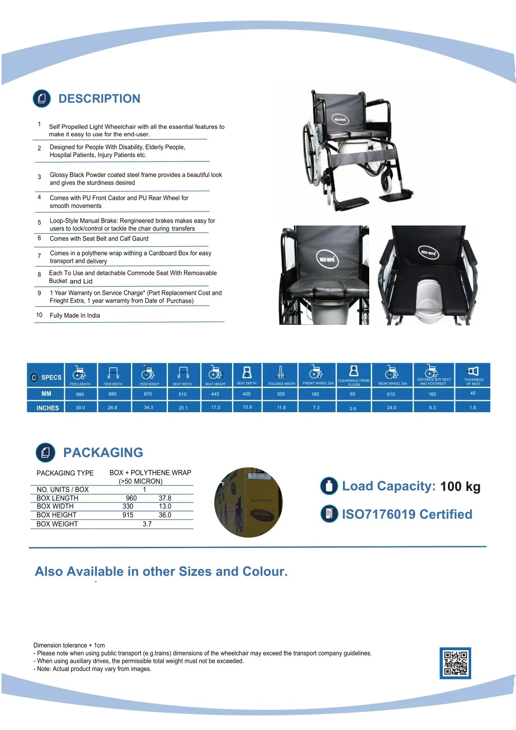 DESCRIPTION 1 Self Propelled Light Wheelchair with all the essential features to make it easy to use for the end-user. Designed for People With Disability, Elderly People, Hospital Patients, Injury Patients etc. 2 Glossy Black Powder coated steel frame provides a beautiful look and gives the sturdiness desired 3 4 Comes with PU Front Castor and PU Rear Wheel for smooth movements Loop-Style Manual Brake: Rengineered brakes makes easy for users to lock/control or tackle the chair during transfers Comes with Seat Belt and Calf Gaurd 5 6 Comes in a polythene wrap withing a Cardboard Box for easy transport and delivery 7 Each To Use and detachable Commode Seat With Remoavable Bucket and Lid 8 1 Year Warranty on Service Charge* (Part Replacement Cost and Frieght Extra, 1 year warramty from Date of Purchase) 9 10 Fully Made In India SPECS DISTANCE B/W SEAT AND FOOTREST THICKNESS OF SEAT CLEARANCE FROM FLOOR FRONT WHEEL DIA SEAT DEPTH REAR WHEEL DIA FOLDING WIDTH ITEM LENGTH ITEM WIDTH ITEM HEIGHT SEAT WIDTH SEAT HEIGHT MM 45 445 405 300 680 870 65 610 160 510 185 990 15.9 INCHES 34.3 17.5 11.8 7.3 24.0 6.3 1.8 39.0 26.8 20.1 2.6 PACKAGING BOX + POLYTHENE WRAP (>50 MICRON) 1 960 330 915 3.7 PACKAGING TYPE Load Capacity: 100 kg NO. UNITS / BOX BOX LENGTH BOX WIDTH BOX HEIGHT BOX WEIGHT 37.8 13.0 36.0 ISO7176019 Certified Also Available in other Sizes and Colour. - Dimension tolerance + 1cm - Please note when using public transport (e.g.trains) dimensions of the wheelchair may exceed the transport company guidelines. - When using auxiliary drives, the permissible total weight must not be exceeded. - Note: Actual product may vary from images.