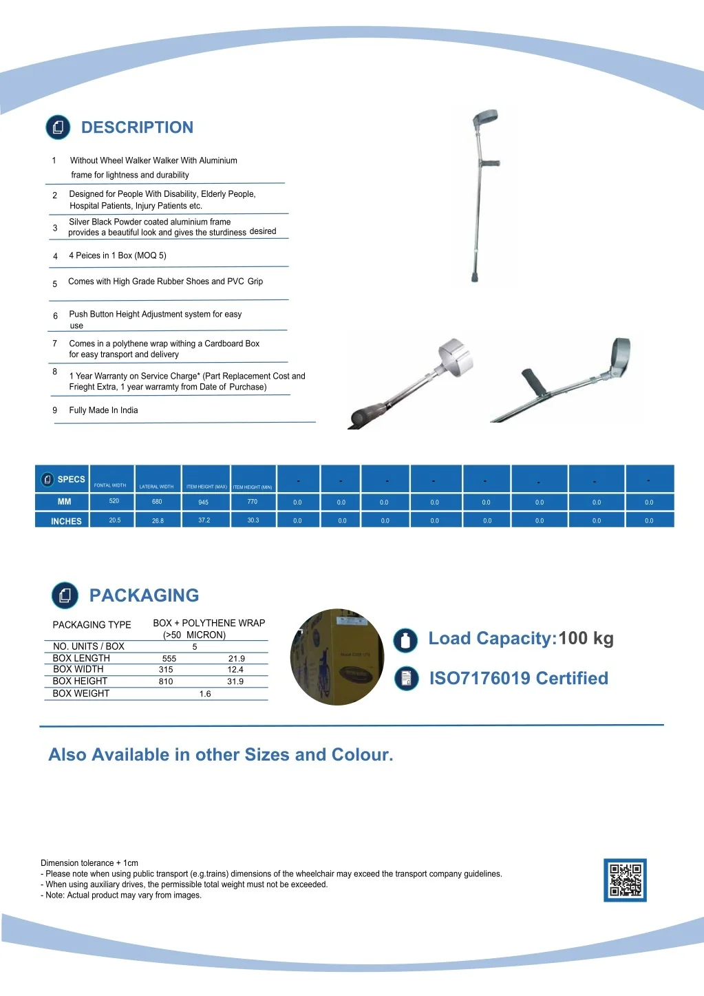 DESCRIPTION 1 Without Wheel Walker Walker With Aluminium frame for lightness and durability Designed for People With Disability, Elderly People, Hospital Patients, Injury Patients etc. 2 Silver Black Powder coated aluminium frame provides a beautiful look and gives the sturdiness desired 3 4 Peices in 1 Box (MOQ 5) 4 Comes with High Grade Rubber Shoes and PVC Grip 5 Push Button Height Adjustment system for easy use 6 Comes in a polythene wrap withing a Cardboard Box for easy transport and delivery 7 8 1 Year Warranty on Service Charge* (Part Replacement Cost and Frieght Extra, 1 year warramty from Date of Purchase) Fully Made In India 9 SPECS - - - - - - - - FONTAL WIDTH LATERAL WIDTH ITEM HEIGHT (MAX) ITEM HEIGHT (MIN) MM 520 680 770 0.0 0.0 0.0 0.0 0.0 0.0 0.0 0.0 945 INCHES 20.5 37.2 30.3 0.0 0.0 0.0 0.0 0.0 0.0 0.0 0.0 26.8 PACKAGING BOX + POLYTHENE WRAP (>50 MICRON) 5 555 315 810 1.6 PACKAGING TYPE 100 kg Load Capacity: NO. UNITS / BOX BOX LENGTH BOX WIDTH BOX HEIGHT BOX WEIGHT 21.9 12.4 31.9 ISO7176019 Certified Also Available in other Sizes and Colour. Dimension tolerance + 1cm - Please note when using public transport (e.g.trains) dimensions of the wheelchair may exceed the transport company guidelines. - When using auxiliary drives, the permissible total weight must not be exceeded. - Note: Actual product may vary from images.