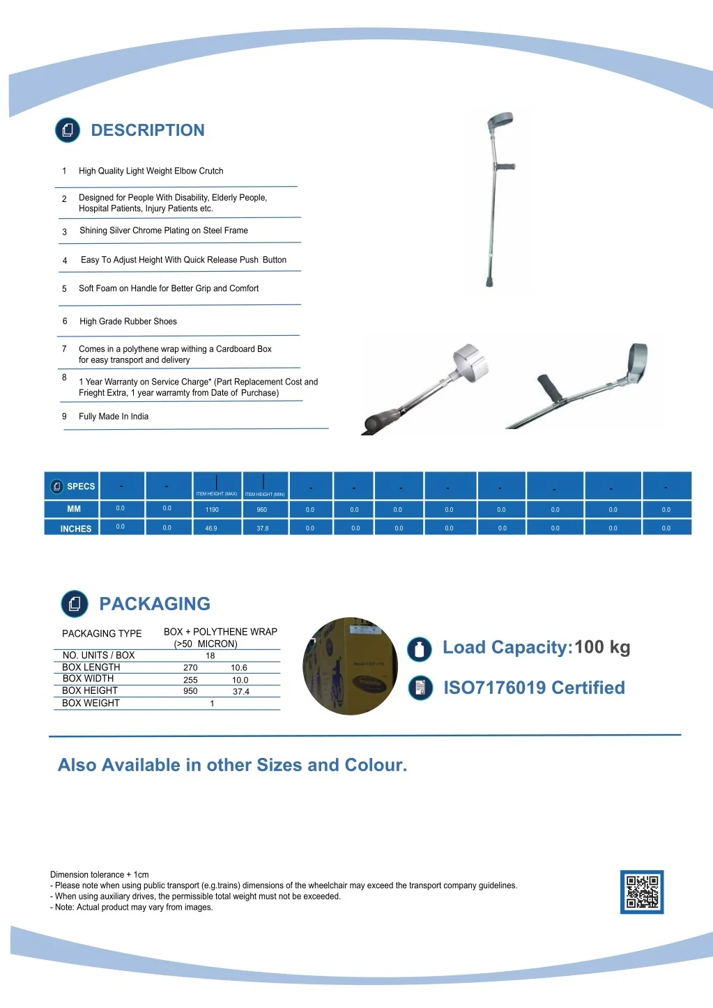 DESCRIPTION 1 High Quality Light Weight Elbow Crutch Designed for People With Disability, Elderly People, Hospital Patients, Injury Patients etc. 2 Shining Silver Chrome Plating on Steel Frame 3 Easy To Adjust Height With Quick Release Push Button 4 Soft Foam on Handle for Better Grip and Comfort 5 6 High Grade Rubber Shoes Comes in a polythene wrap withing a Cardboard Box for easy transport and delivery 7 8 1 Year Warranty on Service Charge* (Part Replacement Cost and Frieght Extra, 1 year warramty from Date of Purchase) Fully Made In India 9 - - SPECS - - - - - - - - ITEM HEIGHT (MAX) ITEM HEIGHT (MIN) MM 0.0 0.0 0.0 0.0 0.0 0.0 0.0 0.0 0.0 0.0 1190 960 0.0 INCHES 0.0 0.0 0.0 0.0 0.0 0.0 0.0 0.0 0.0 46.9 37.8 PACKAGING BOX + POLYTHENE WRAP (>50 MICRON) 18 270 255 950 1 PACKAGING TYPE 100 kg Load Capacity: NO. UNITS / BOX BOX LENGTH BOX WIDTH BOX HEIGHT BOX WEIGHT 10.6 10.0 37.4 ISO7176019 Certified Also Available in other Sizes and Colour. Dimension tolerance + 1cm - Please note when using public transport (e.g.trains) dimensions of the wheelchair may exceed the transport company guidelines. - When using auxiliary drives, the permissible total weight must not be exceeded. - Note: Actual product may vary from images.