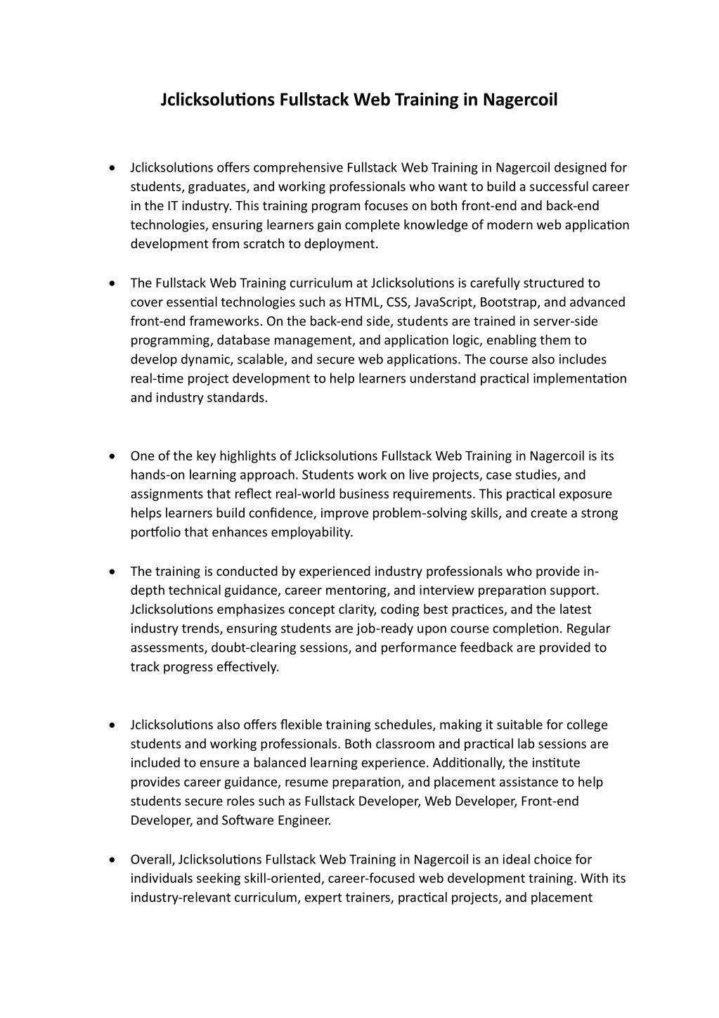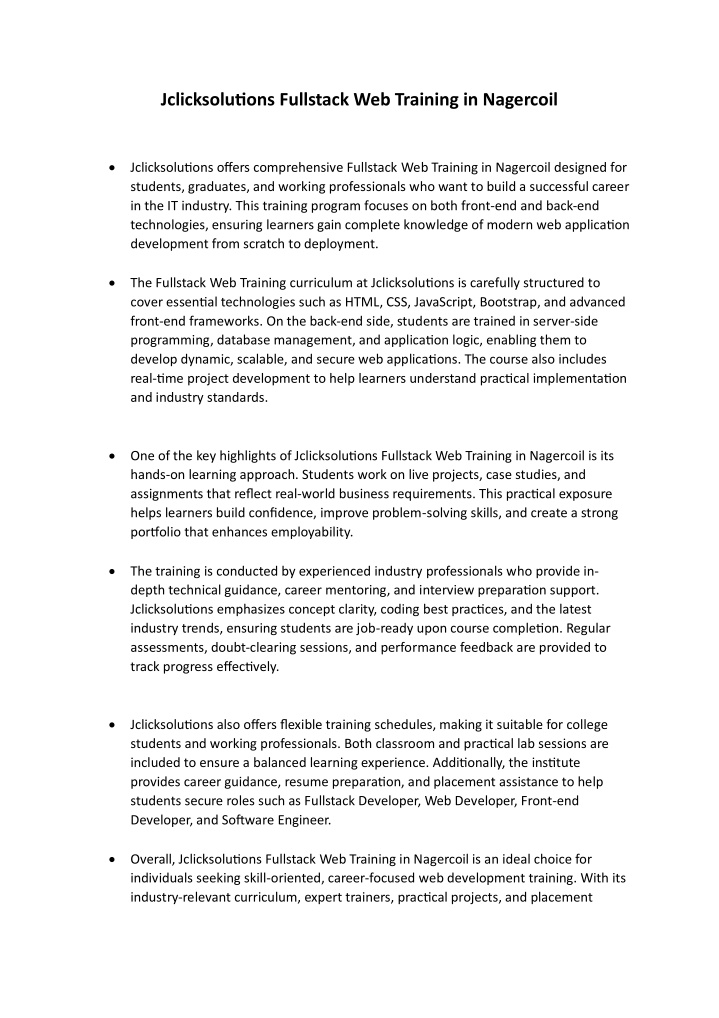 1. Jclicksolutions Fullstack Web Training in Nagercoil Jclicksolutions offers comprehensive Fullstack Web Training in Nagercoil designed for students, graduates, and working professionals who want to build a successful career in the IT industry. This training program focuses on both front-end and back-end technologies, ensuring learners gain complete knowledge of modern web application development from scratch to deployment. The Fullstack Web Training curriculum at Jclicksolutions is carefully structured to cover essential technologies such as HTML, CSS, JavaScript, Bootstrap, and advanced front-end frameworks. On the back-end side, students are trained in server-side programming, database management, and application logic, enabling them to develop dynamic, scalable, and secure web applications. The course also includes real-time project development to help learners understand practical implementation and industry standards. One of the key highlights of Jclicksolutions Fullstack Web Training in Nagercoil is its hands-on learning approach. Students work on live projects, case studies, and assignments that reflect real-world business requirements. This practical exposure helps learners build confidence, improve problem-solving skills, and create a strong portfolio that enhances employability. The training is conducted by experienced industry professionals who provide in- depth technical guidance, career mentoring, and interview preparation support. Jclicksolutions emphasizes concept clarity, coding best practices, and the latest industry trends, ensuring students are job-ready upon course completion. Regular assessments, doubt-clearing sessions, and performance feedback are provided to track progress effectively. Jclicksolutions also offers flexible training schedules, making it suitable for college students and working professionals. Both classroom and practical lab sessions are included to ensure a balanced learning experience. Additionally, the institute provides career guidance, resume preparation, and placement assistance to help students secure roles such as Fullstack Developer, Web Developer, Front-end Developer, and Software Engineer. Overall, Jclicksolutions Fullstack Web Training in Nagercoil is an ideal choice for individuals seeking skill-oriented, career-focused web development training. With its industry-relevant curriculum, expert trainers, practical projects, and placement