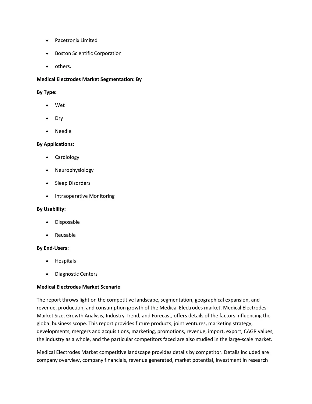 Pacetronix Limited Boston Scientific Corporation others. Medical Electrodes Market Segmentation: By By Type: Wet Dry Needle By Applications: Cardiology Neurophysiology Sleep Disorders Intraoperative Monitoring By Usability: Disposable Reusable By End-Users: Hospitals Diagnostic Centers Medical Electrodes Market Scenario The report throws light on the competitive landscape, segmentation, geographical expansion, and revenue, production, and consumption growth of the Medical Electrodes market. Medical Electrodes Market Size, Growth Analysis, Industry Trend, and Forecast, offers details of the factors influencing the global business scope. This report provides future products, joint ventures, marketing strategy, developments, mergers and acquisitions, marketing, promotions, revenue, import, export, CAGR values, the industry as a whole, and the particular competitors faced are also studied in the large-scale market. Medical Electrodes Market competitive landscape provides details by competitor. Details included are company overview, company financials, revenue generated, market potential, investment in research