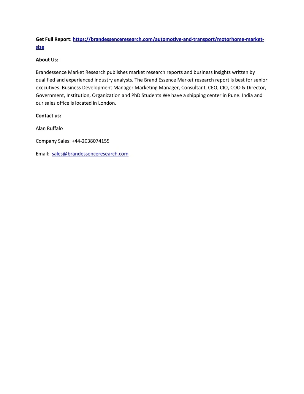 Get Full Report:https://brandessenceresearch.com/automotive-and-transport/motorhome-market- size About Us: Brandessence Market Research publishes market research reports and business insights written by qualified and experienced industry analysts. The Brand Essence Market research report is best for senior executives. Business Development Manager Marketing Manager, Consultant, CEO, CIO, COO & Director, Government, Institution, Organization and PhD Students We have a shipping center in Pune. India and our sales office is located in London. Contact us: Alan Ruffalo Company Sales: +44-2038074155 Email: sales@brandessenceresearch.com