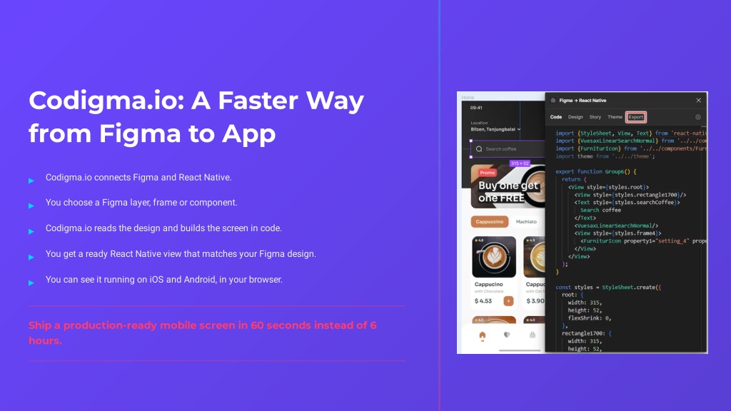 1. From Figma Design to Real Mobile App Turn your Figma screens into a working React Native app in about 60 seconds. Codigma.io helps you ship production-ready mobile apps much faster. Figma → Code → Real iOS & Android preview → Download your project.