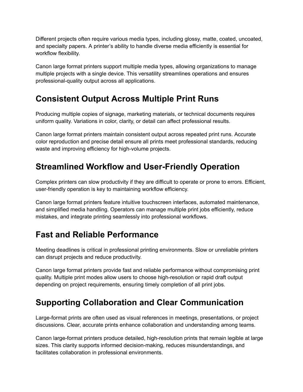 Long-Term Reliability and Cost Efficiency Professional printing equipment must be durable, efficient, and predictable. Unreliable printers increase downtime, waste, and operational costs. Canon large-format printers are designed for long-term reliability. Optimized ink usage, automated maintenance, and robust construction ensure cost-effective, consistent printing that meets professional standards over time. Scalability for Growing Business Needs As businesses grow, printing requirements often increase in volume, complexity, and media diversity. Scalable solutions are essential to accommodate higher workloads without frequent equipment upgrades. Canon large-format printers provide adaptability to manage increasing project demands and diverse media types. Their scalability ensures consistent quality, workflow efficiency, and professional-grade results across all large-format printing applications. Conclusion Canon large format printers offer precise, high-resolution printing with versatile media handling and operational efficiency for businesses and creative professionals. They provide accurate technical prints, vibrant creative outputs, and consistent results across multiple print runs. By supporting workflow efficiency, collaboration, and long-term reliability, Canon large format printers remain essential for professionals seeking dependable, high-quality large-scale printing solutions across all applications.