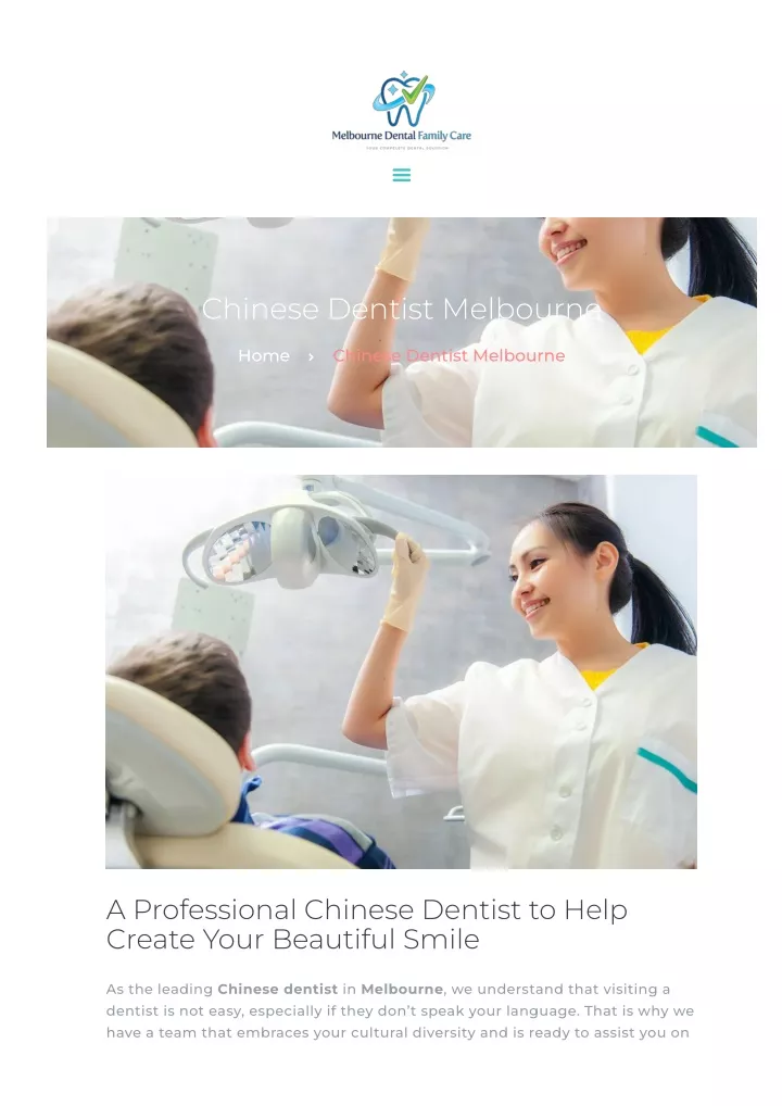 Chinese Dentist Melbourne Home Chinese Dentist Melbourne A Professional Chinese Dentist to Help Create Your Beautiful Smile As the leading Chinese dentist in Melbourne, we understand that visiting a dentist is not easy, especially if they don’t speak your language. That is why we have a team that embraces your cultural diversity and is ready to assist you on appointment. We offer a wide range of dental and oral health services for all
