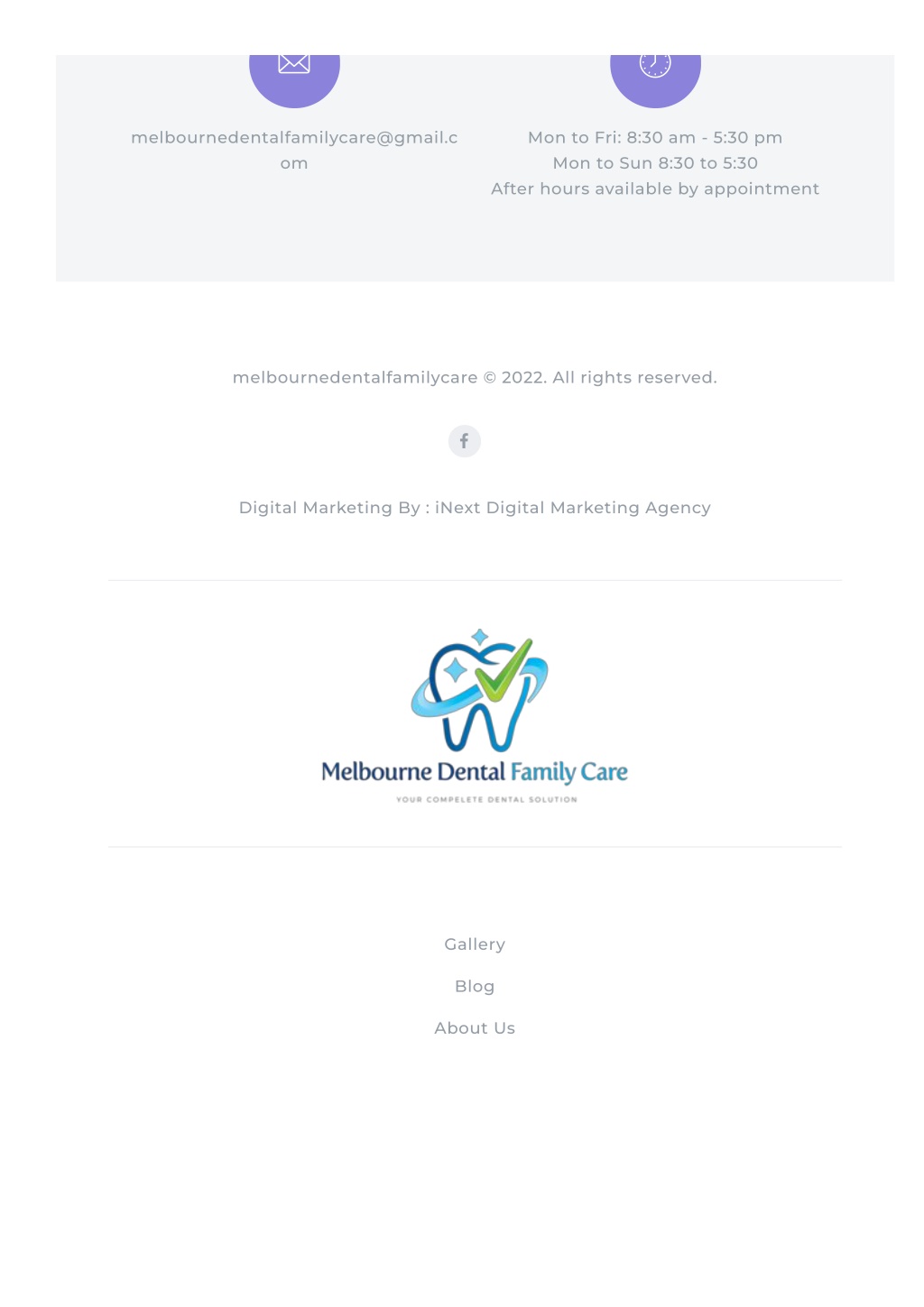 melbournedentalfamilycare@gmail.c om Mon to Fri: 8:30 am - 5:30 pm Mon to Sun 8:30 to 5:30 After hours available by appointment melbournedentalfamilycare © 2022. All rights reserved. Digital Marketing By : iNext Digital Marketing Agency Gallery Blog About Us