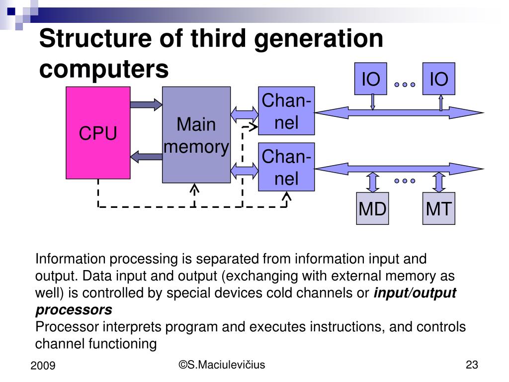 Structureof third generation computers IO IO CPU Main memory Chan- nel Chan- nel MD MT Information processing is separated from information input and output. Data input and output (exchanging with external memory as well) is controlled by special devices cold channels orinput/output processors Processor interprets program and executesinstructions,and controls channel functioning ©S.Maciulevičius