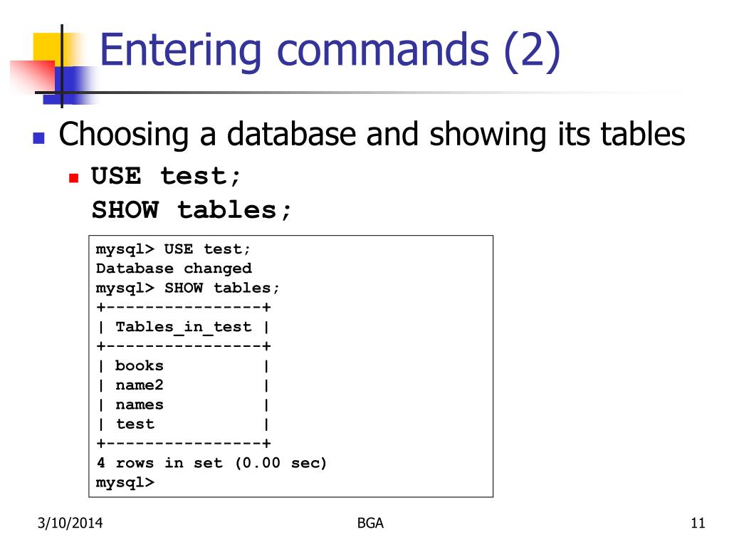 Entering commands (2) • Choosing a database and showing its tables • USE test;SHOW tables; mysql> USE test;Database changedmysql> SHOW tables;+----------------+| Tables_in_test |+----------------+| books || name2 || names || test |+----------------+4 rows in set (0.00 sec)mysql> BGA