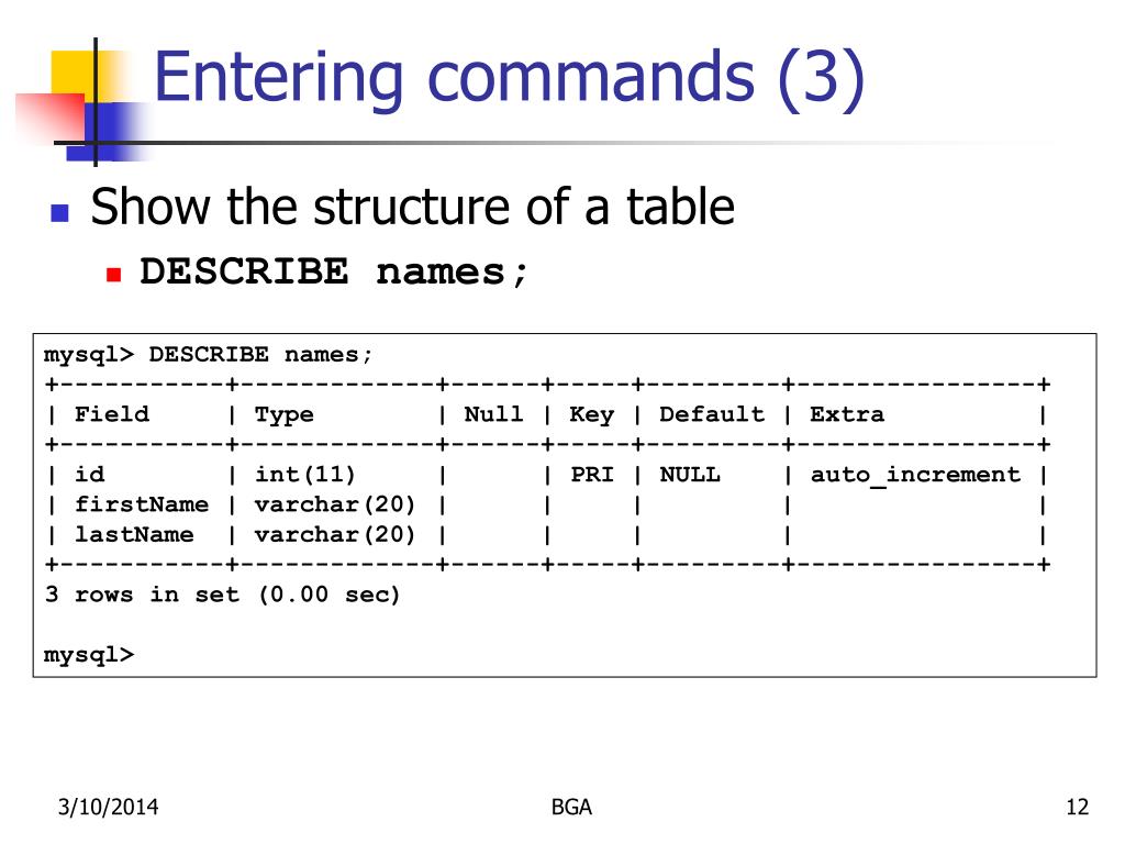 Entering commands (3) • Show the structure of a table • DESCRIBE names; mysql> DESCRIBE names;+-----------+-------------+------+-----+---------+----------------+| Field | Type | Null | Key | Default | Extra |+-----------+-------------+------+-----+---------+----------------+| id | int(11) | | PRI | NULL | auto_increment || firstName | varchar(20) | | | | || lastName | varchar(20) | | | | |+-----------+-------------+------+-----+---------+----------------+3 rows in set (0.00 sec)mysql> BGA