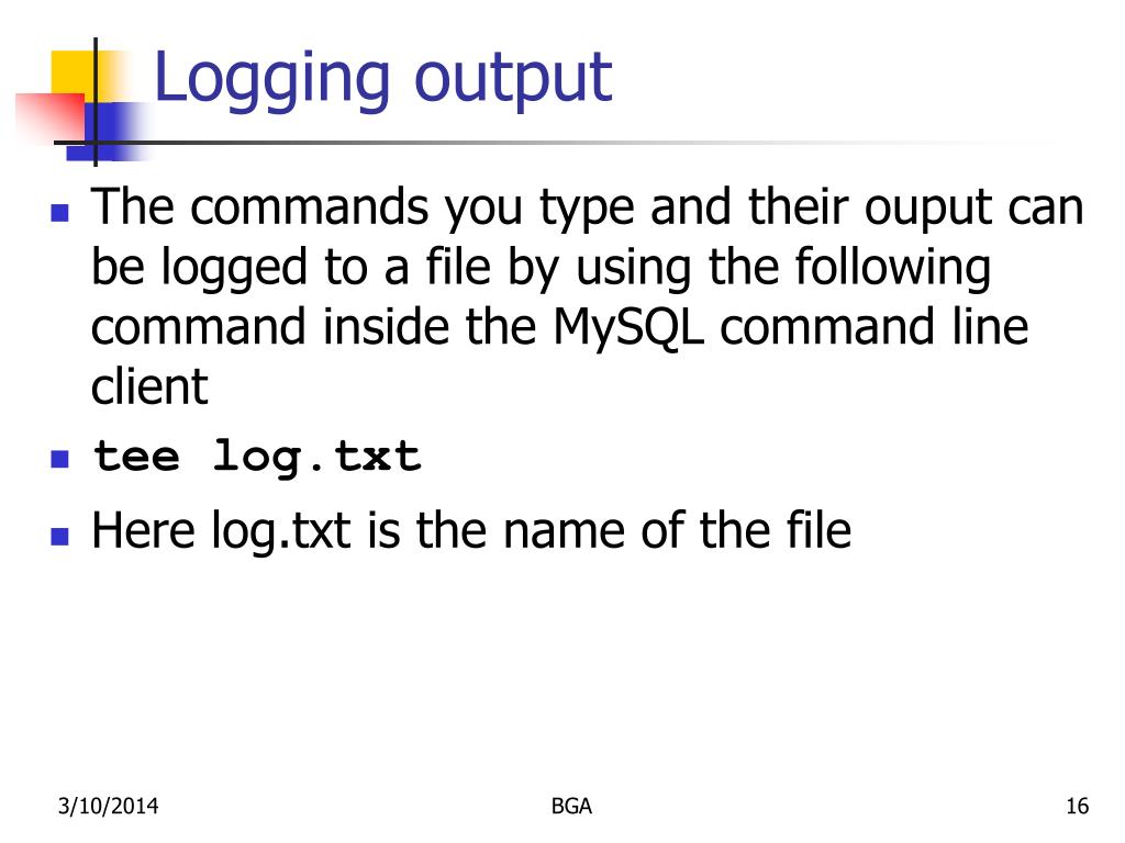 Logging output • The commands you type and their ouput can be logged to a file by using the following command inside the MySQL command line client • tee log.txt • Here log.txt is the name of the file BGA