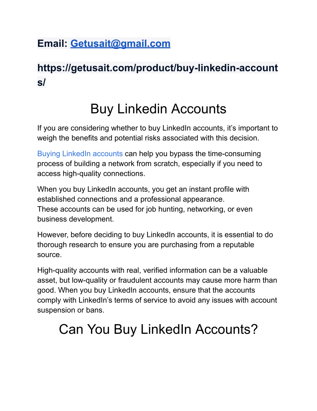 Email: Getusait@gmail.com https://getusait.com/product/buy-linkedin-account s/ Buy Linkedin Accounts If you are considering whether to buy LinkedIn accounts, it’s important to weigh the benefits and potential risks associated with this decision. Buying LinkedIn accounts can help you bypass the time-consuming process of building a network from scratch, especially if you need to access high-quality connections. When you buy LinkedIn accounts, you get an instant profile with established connections and a professional appearance. These accounts can be used for job hunting, networking, or even business development. However, before deciding to buy LinkedIn accounts, it is essential to do thorough research to ensure you are purchasing from a reputable source. High-quality accounts with real, verified information can be a valuable asset, but low-quality or fraudulent accounts may cause more harm than good. When you buy LinkedIn accounts, ensure that the accounts comply with LinkedIn’s terms of service to avoid any issues with account suspension or bans. Can You Buy LinkedIn Accounts?
