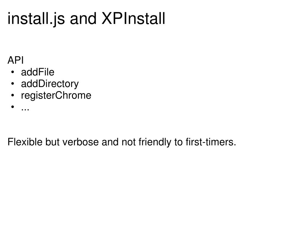 install.js and XPInstall API • addFile • addDirectory • registerChrome • ... Flexible but verbose and not friendly to first-timers.