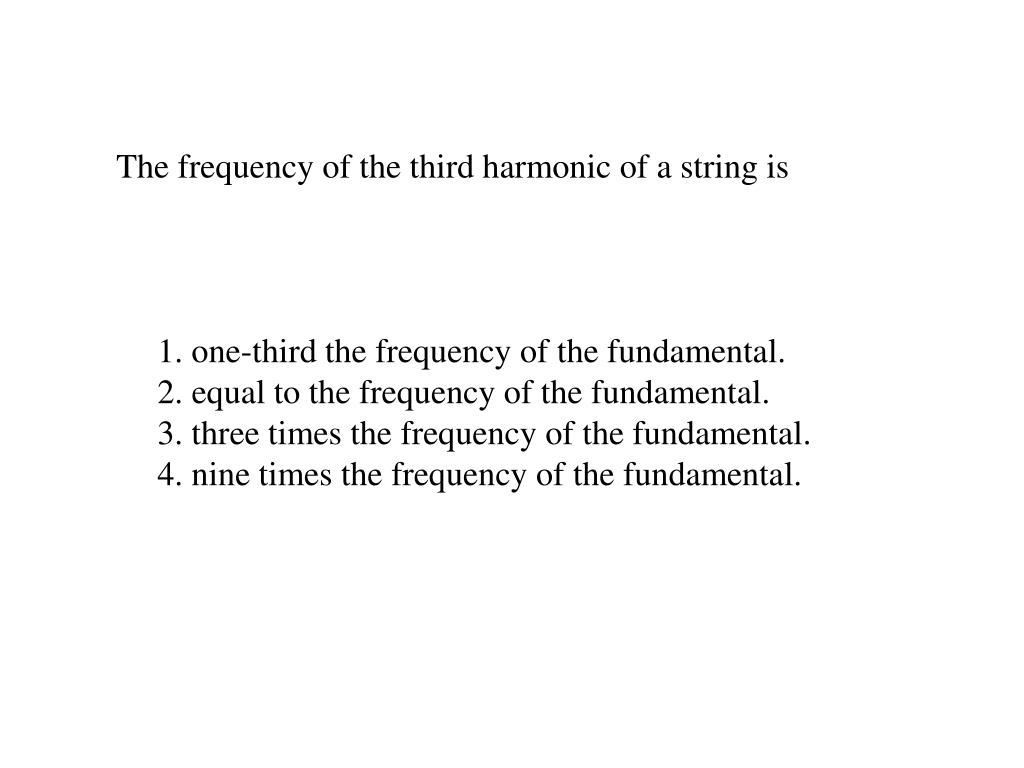 The frequency of the third harmonic of a string is 1. one-third the frequency of the fundamental. 2. equal to the frequency of the fundamental. 3. three times the frequency of the fundamental. 4. nine times the frequency of the fundamental.