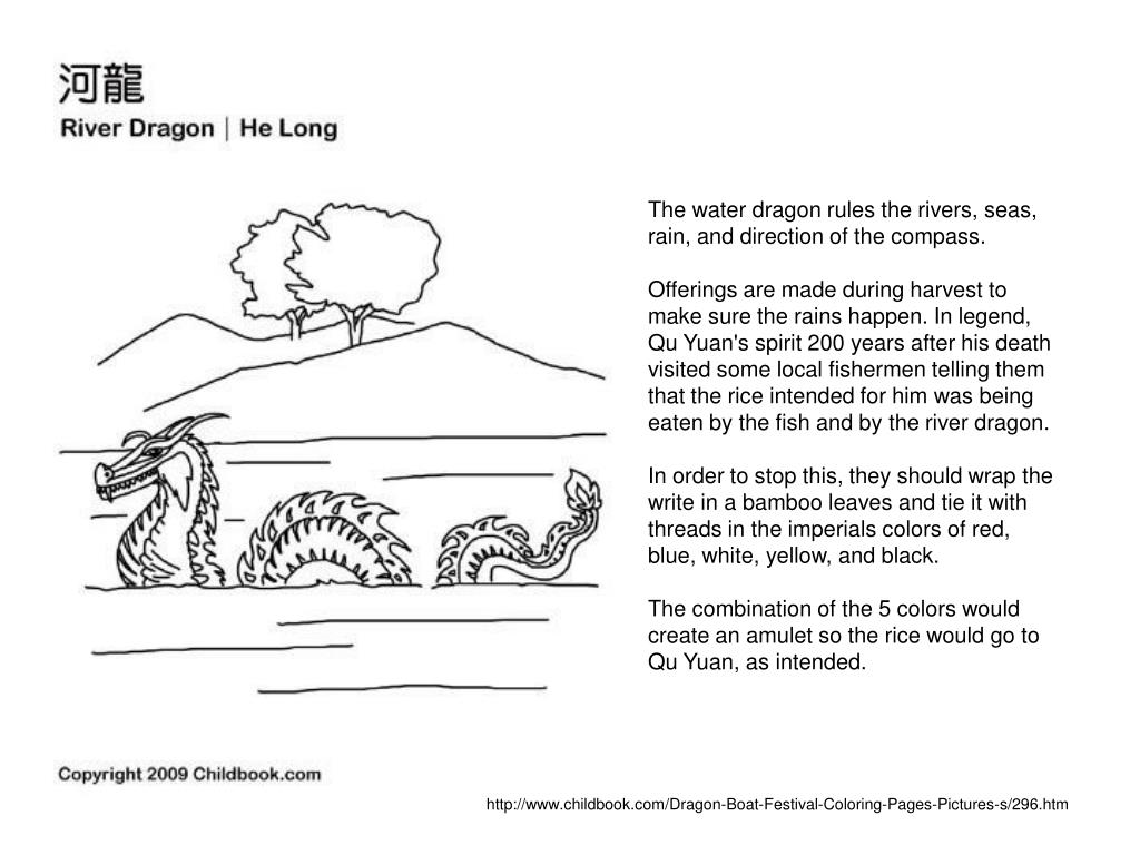The water dragon rules the rivers, seas, rain, and direction of the compass. Offerings are made during harvest to make sure the rains happen. In legend, Qu Yuan's spirit 200 years after his death visited some local fishermen telling them that the rice intended for him was being eaten by the fish and by the river dragon. In order to stop this, they should wrap the write in a bamboo leaves and tie it with threads in the imperials colors of red, blue, white, yellow, and black. The combination of the 5 colors would create an amulet so the rice would go to Qu Yuan, as intended. http://www.childbook.com/Dragon-Boat-Festival-Coloring-Pages-Pictures-s/296.htm