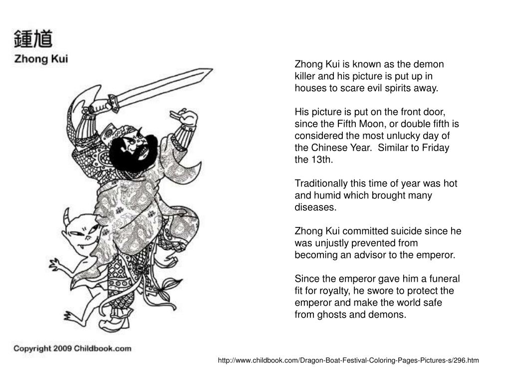 Zhong Kui is known as the demon killer and his picture is put up in houses to scare evil spirits away. His picture is put on the front door, since the Fifth Moon, or double fifth is considered the most unlucky day of the Chinese Year. Similar to Friday the 13th. Traditionally this time of year was hot and humid which brought many diseases. Zhong Kui committed suicide since he was unjustly prevented from becoming an advisor to the emperor. Since the emperor gave him a funeral fit for royalty, he swore to protect the emperor and make the world safe from ghosts and demons. http://www.childbook.com/Dragon-Boat-Festival-Coloring-Pages-Pictures-s/296.htm